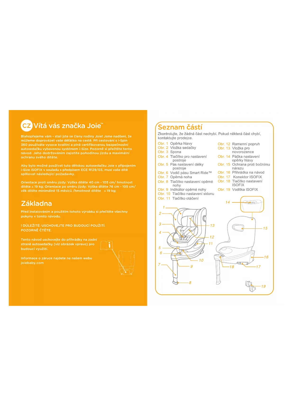Blahopřejeme vám - stali jste se členy rodiny Joie! Jsme nadšeni, že můžeme doprovázet vaše děťátko na cestě. Při cestování s i-Spin 360 používáte vysoce kvalitní a plně certifikovanou bezpečnostní autosedačku vybavenou systémem i-Size. Pozorně si přečtěte tento návod. Jeho dodržováním zajistíte pohodlnou jízdu a maximální ochranu svého dítěte.Aby bylo možné používat tuto dětskou autosedačku Joie s připojením i-Size ISOFIX v souladu s předpisem ECE R129/03, musí vaše dítě splňovat následující požadavky.Orientace proti směru jízdy: Výška dítěte 40 cm - 105 cm/ hmotnost dítěte 19 kg; Orientace po směru jízdy: Výška dítěte 76 cm - 105 cm/ věk dítěte minimálně 15 měsíců /hmotnost dítěte 19 kg; Základna Před instalováním a použitím tohoto výrobku si přečtěte všechny pokyny v tomto návodu.! DŮLEŽITÉ: USCHOVEJTE PRO BUDOUCÍ POUŽITÍ. POZORNĚ ČTĚTE.Tento návod uschovejte do přihrádky na zadnístraně autosedačky (viz obrázek vpravo) probudoucí využití.Informace o záruce najdete na našem webujoiebaby.com Seznam částí Obr. 1 Opěrka hlavyObr. 2 Vložka sedačkyObr. 3 SponaObr. 4 Tlačítko pro nastavení postrojeObr. 5 Pás nastavení délky postrojeObr. 6 Vodič pásu Smart Ride™Obr. 7 Opěrná nohaObr. 8 Tlačítko nastavení opěrné nohy Obr. 9 Indikátor opěrné nohyObr. 10 Tlačítko nastavení sklonuObr. 11 Tlačítko otáčeníObr. 12 Ramenní popruhObr. 13 Vložka pro novorozenceObr. 14 Páčka nastavení opěrky hlavyObr. 15 Ochrana proti bočnímu nárazuObr. 16 Přihrádka na návodObr. 17 Konektor ISOFIXObr. 18 Tlačítko nastavení ISOFIXObr. 19 Vodítka ISOFIXZkontrolujte, že žádná část nechybí. Pokud některá část chybí, kontaktujte prodejce.