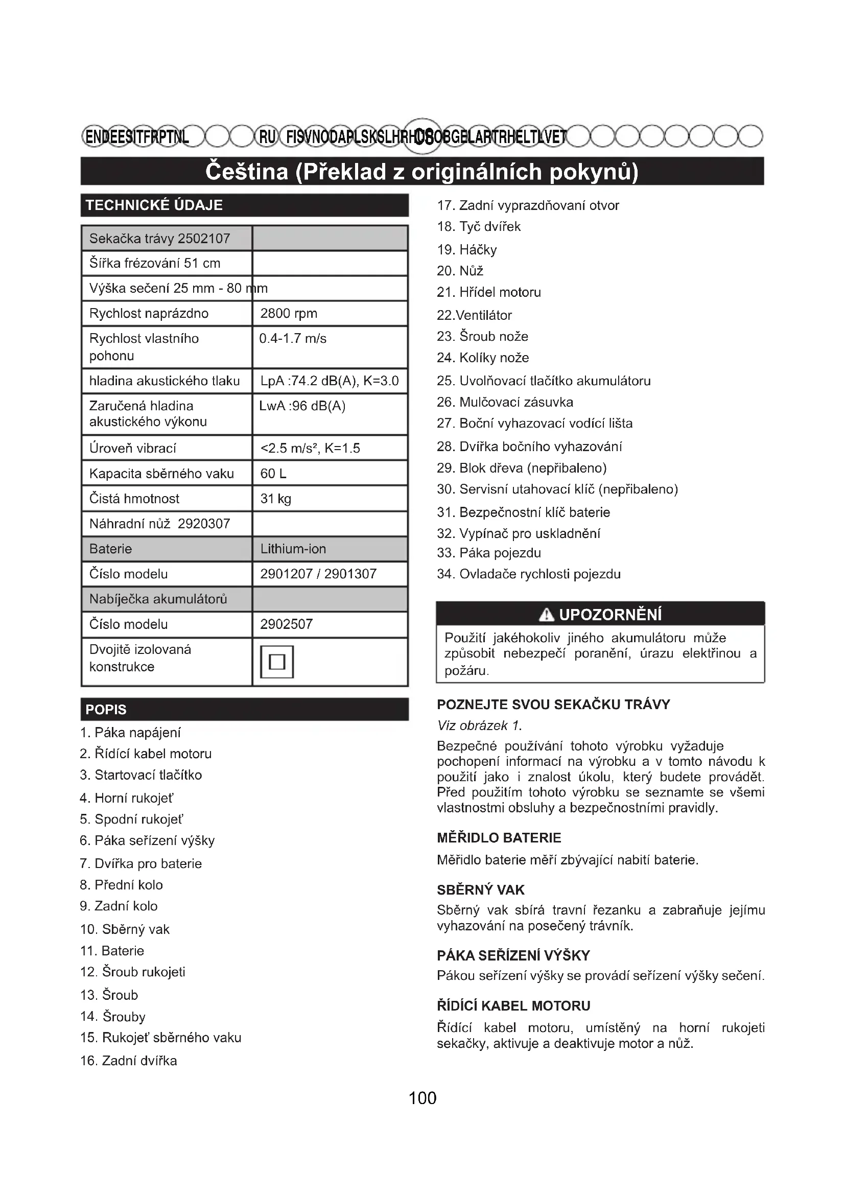 FI SV NO DA PL SK SL HR HU RO BG EL AR TR HE LT LV ET TECHNICKÉ ÚDAJESekačka trávy 2502107Šířka frézování 51 cmVýška sečení 25 mm - 80 mmRychlost naprázdno 2800 rpmRychlost vlastního pohonu0.4-1.7 m/shladina akustického tlaku LpA :74.2 dB(A), K=3.0Zaručená hladinaakustického výkonuLwA :96 dB(A)Úroveň vibrací <2.5 m/s², K=1.5Kapacita sběrného vaku 60 LČistá hmotnost 31 kgNáhradní nůž 2920307Baterie Lithium-ionČíslo modelu 2901207 / 2901307Nabíječka akumulátorůČíslo modelu 2902507Dvojitě izolovaná konstrukcePOPIS1. Páka napájení2. Řídící kabel motoru3. Startovací tlačítko4. Horní rukojeť5. Spodní rukojeť6. Páka seřízení výšky7. Dvířka pro baterie8. Přední kolo9. Zadní kolo10. Sběrný vak11. Baterie12. Šroub rukojeti13. Šroub Šrouby15. Rukojeť sběrného vaku16. Zadní dvířka17. Zadní vyprazdňovaní otvor18. Tyč dvířek19. Háčky20. Nůž21. Hřídel motoru22.Ventilátor23. Šroub nože24. Kolíky nože25. Uvolňovací tlačítko akumulátoru26. Mulčovací zásuvka27. Boční vyhazovací vodící lišta28. Dvířka bočního vyhazování29. Blok dřeva (nepřibaleno)30. Servisní utahovací klíč (nepřibaleno)31. Bezpečnostní klíč baterie32. Vypínač pro uskladnění33. Páka pojezdu34. Ovladače rychlosti pojezdu UPOZORNĚNÍ Použití jakéhokoliv jiného akumulátoru může způsobit nebezpečí poranění, úrazu elektřinou a požáru. POZNEJTE SVOU SEKAČKU TRÁVYViz obrázek 1.Bezpečné používání tohoto výrobku vyžaduje pochopení informací na výrobku a v tomto návodu k použití jako i znalost úkolu, který budete provádět. Před použitím tohoto výrobku se seznamte se všemi vlastnostmi obsluhy a bezpečnostními pravidly.MĚŘIDLO BATERIEMěřidlo baterie měří zbývající nabití baterie.SBĚRNÝ VAK Sběrný vak sbírá travní řezanku a zabraňuje jejímu vyhazování na posečený trávník.PÁKA SEŘÍZENÍ VÝŠKY Pákou seřízení výšky se provádí seřízení výšky sečení.