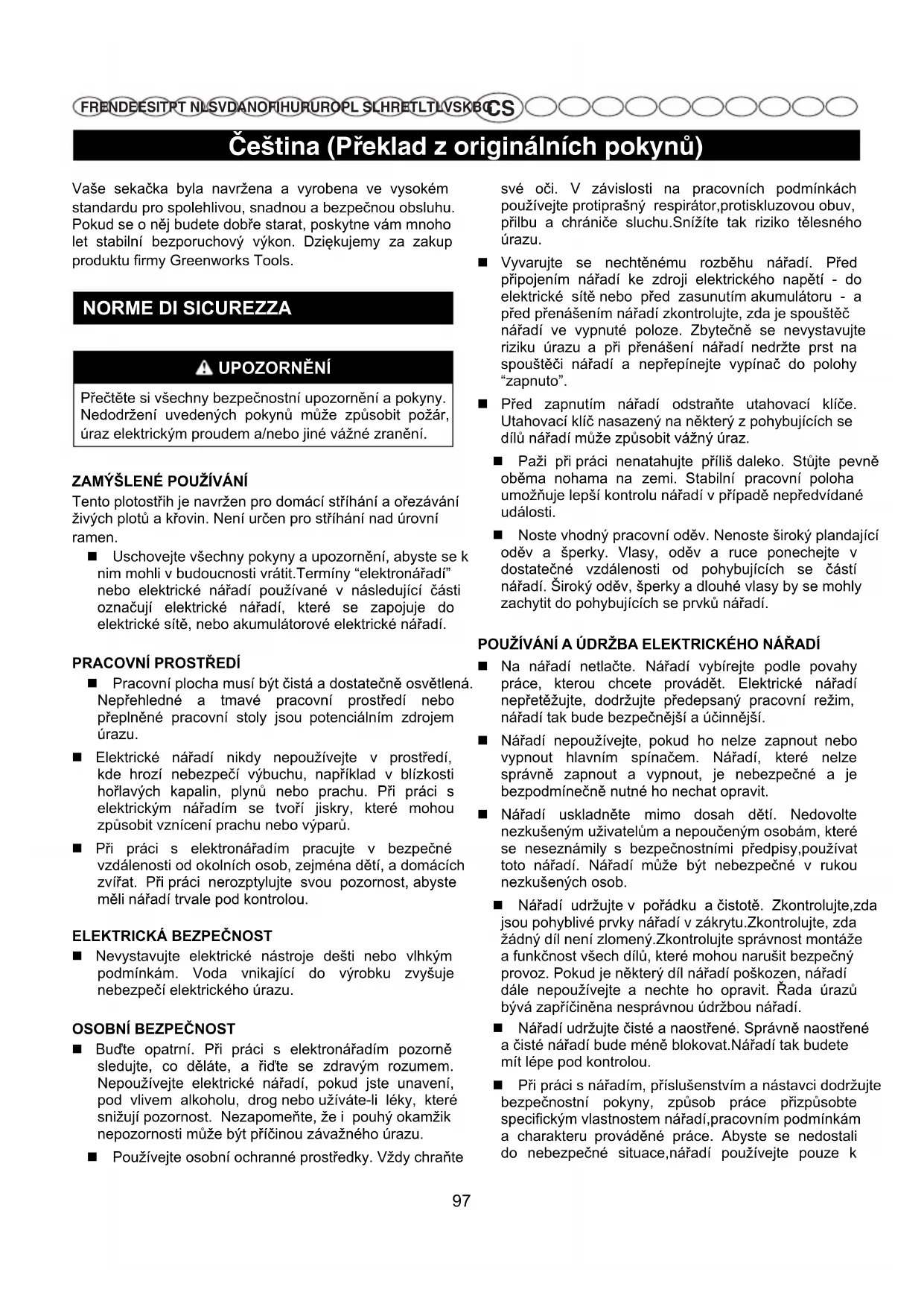 FR EN DE ES IT PT NL SV DA NO FI HU RU RO PL SL HR ET LT LV SK BG NEBEZPEČÍ Pokud se chybnou manipulací zuby dostanou do záběru s elektrickým kabelem, NEDOTÝKEJTE SE STŘÍHACÍ LIŠTY! MŮŽE BÝT POD PROUDEM! TO JE VELMI NEBEZPEČNÁ SITUACE. Držte zahradní nůžky za hlavní rukojeť (ta je izolovaná) a položte opatrně nářadí co nejdále od sebe. Vypněte pojistky, abyste přerušili přívod elektrického proudu k zahradnímu nářadí a pak teprve vyprostěte kabel ze zubů stříhací lišty. Nedodržení tohoto pokynu může způsobit vážné zranění nebo i smrtelný úraz. UPOZORNĚNÍ Před každým použitím nářadí, vyčistěte pracovní zónu. Odstraňte elektrické kabely, vodiče, přípojné elektrické kabely z dosahu stříhací lišty, aby se tyto předměty nemohly dostat do kontaktu s nářadím a způsobit vám závažný úraz. UPOZORNĚNÍ K čištění plastových dílů nepoužívejte ředidla. Většina ředidel běžně dostupných v obchodní síti se nehodí k čištění plastových částí, neboť narušuje povrch plastů. K odstranění nečistot, oleje, maziv apod. používejte čistýhadr. Při výměně prvků pily je nutné použít pouze originální náhradní díly značky Greenworls Tools.Použití neznačkových dílů může nejen poškodit přístroj, ale způsobit i vážné zranění. VAROVÁNÍ Plastové části nářadí nesmí nikdy přijít do styku s brzdovou kapalinou, benzínem, produkty na bázi ropy, regenerovanými maznými oleji apod. Tyto výrobky obsahují chemikálie, které mohou poškodit,oslabit nebo zničit plastové části, případně snížit jejich životnost.