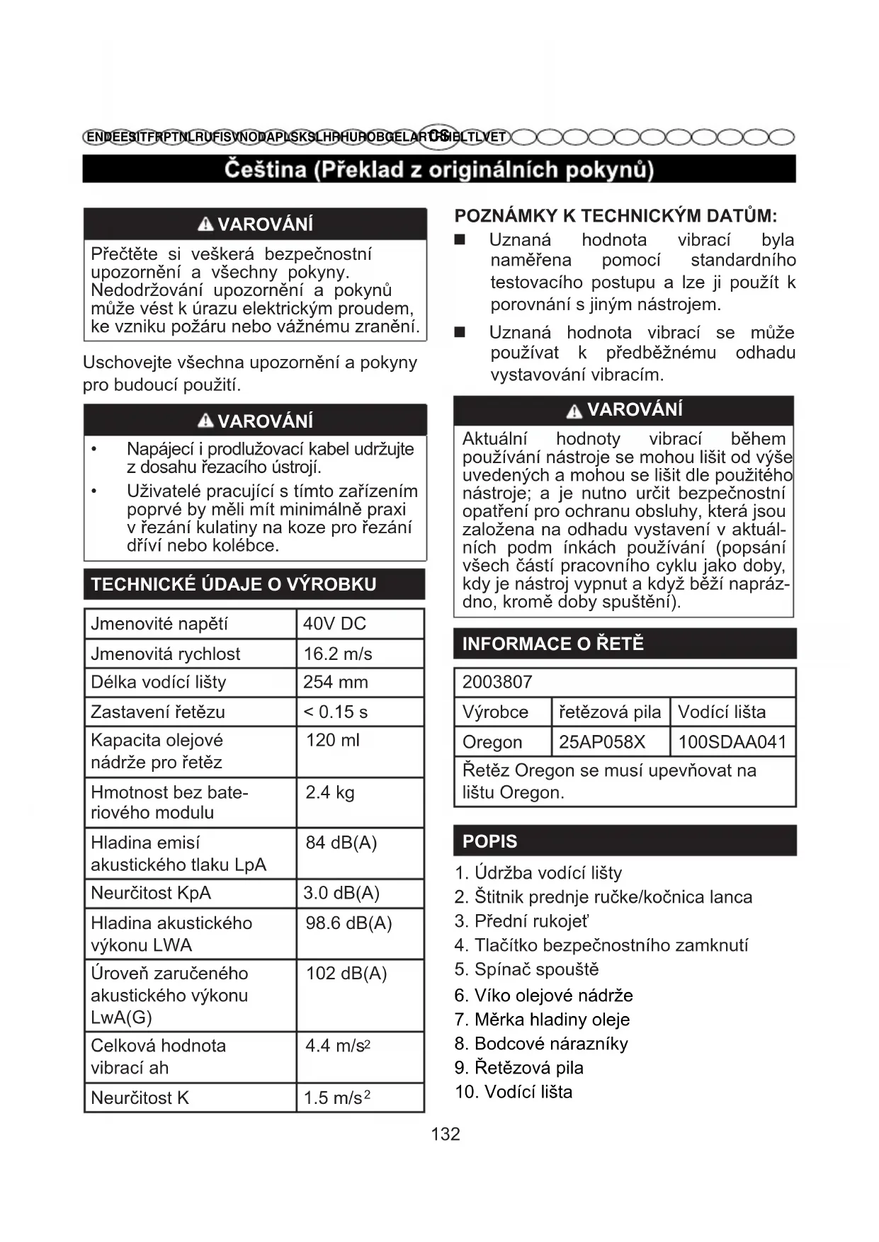 straně svahu,aby se polena nemohla sku- tálet na vás. MONTÁŽ Tato pila nevyžaduje montáž, ale uživatel by měl vědět jak nam ontovat vodící lištu a řetěz pily. A také prosím před každou prací kontrolujte napnutí řetězu a doplňujte olej,jak je popsáno níže v tomto návodu. MONTÁŽ VODÍCÍ LIŠTY A ŘEZACÍHO ŘETĚZU Viz obrázek 2 - 7 Zajistěte vyjmutí akumulátoru ze zařízení. Použijte ochranné rukavice. Odšroubujte upevňovací matice krytu řetězového kola a kryt řetězového kola sejměte. Jednotlivé řezné články řetězu musí být otočeny ve směru otáčení řetězu. Pokud směřují obráceně, otočte celý řetěz. Nasaďte vodící články řetězu do drážky vodící lišty. Řetěz musí být umístěn tak, aby vytvořil smyčku v zadní části vodící lišty. Přidržte řetěz na liště a nasaďte smyčku řetězu na řetězové kolo a ujistěte se, že je správně namontován. Ujistěte se, že otvor na liště se shoduje se šroubem pro napnutí řetězu pily. Kryt řetězového kola vraťte zpět, otáčejte šroubem seřízení napětí řetězu směrem doprava, dokud nebude pilový řetěz správně napnutý. Vodicí lišta musí pak být zatlačena nahoru a je třeba znovu zkontrolovat napnutí řetězu. Řetěz příliš nenapínejte. Jakmile je řetěz správně napnutý, znovu matice utáhněte. Poznámka: Řetěz pily je správně nap- nut, pokud lze řezací článek řetězu, v prostřední části vodící lišty, nazvednout 3 mm až 4 mm od horního okraje vodící lišty. Spusťte pilu s novým řetězem a nechejte ji běžet 2-3 minuty. VAROVÁNÍ Po zabíhací době zkontrolujte napnutí řetězu a dle potřeby řetěz dotáhněte.CS EN DE ES IT FR PT NL RU FI SV NO DA PL SK SL HR HU RO BG EL AR TR HE LT LV ET