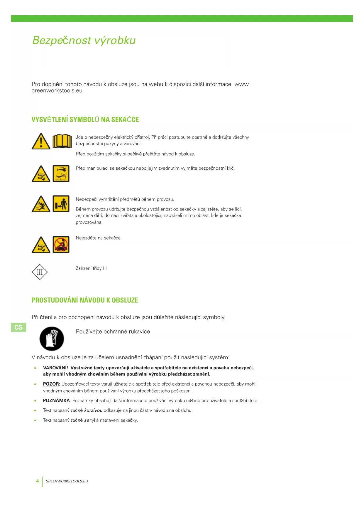 Jde o nebezpečný elektrický přístroj. Při práci postupujte opatrně a dodržujte všechny bezpečnostní pokyny a varování. Před použitím sekačky si pečlivě přečtěte návod k obsluze. Před manipulací se sekačkou nebo jejím zvednutím vyjměte bezpečnostní klíč. Nebezpečí vymrštění předmětů během provozu. Během provozu udržujte bezpečnou vzdálenost od sekačky a zajistěte, aby se lidi, zejména děti, domácí zvířata a okolostojící, nacházeli mimo oblast, kde je sekačka provozována. Nejezděte na sekačce. Zařízení třídy III Pro doplnění tohoto návodu k obsluze jsou na webu k dispozici další informace: www greenworkstools.eu