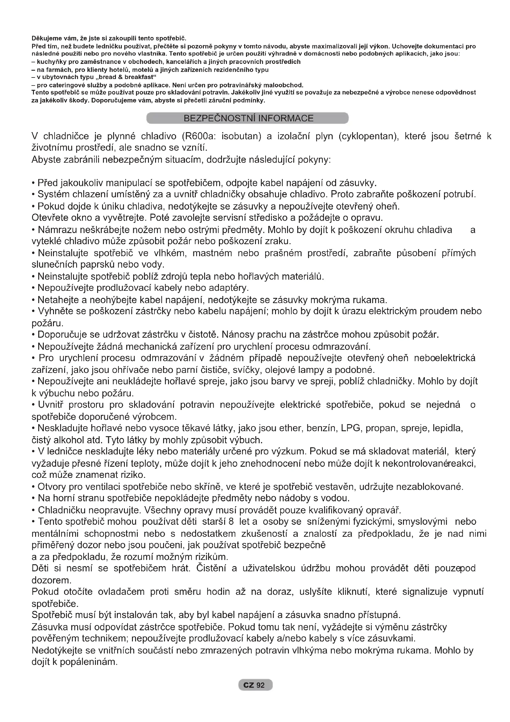 Děkujeme vám, že jste si zakoupili tento spotřebič. Před tím, než budete ledničku používat, přečtěte si pozorně pokyny v tomto návodu, abyste maximalizovali její výkon. Uchovejte dokumentaci pro následné použití nebo pro nového vlastníka. Tento spotřebič je určen použití výhradně v domácnosti nebo podobných aplikacích, jako jsou: – kuchyňky pro zaměstnance v obchodech, kancelářích a jiných pracovních prostředích – na farmách, pro klienty hotelů, motelů a jiných zařízeních rezidenčního typu – v ubytovnách typu „bread & breakfast“ – pro cateringové služby a podobné aplikace. Není určen pro potravinářský maloobchod. Tento spotřebič se může používat pouze pro skladování potravin. Jakékoliv jiné využití se považuje za nebezpečné a výrobce nenese odpovědnost za jakékoliv škody. Doporučujeme vám, abyste si přečetli záruční podmínky. V chladničce je plynné chladivo (R600a: isobutan) a izolační plyn (cyklopentan), které jsou šetrné k životnímu prostředí, ale snadno se vznítí. Abyste zabránili nebezpečným situacím, dodržujte následující pokyny: