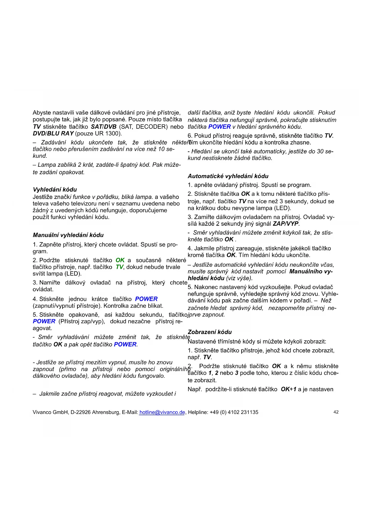 kód správně nastavený. Pokud ovládání nefunguje nebo nefunguje správně, zkuste další kód ze seznamu nebo použijte funkci vyhledání kódu (viz níže). Vivanco GmbH, D-22926 Ahrensburg, E-Mail: hotline@vivanco.de, Helpline: +49 (0) 4102 231135 41Abyste nastavili vaše dálkové ovládání pro jiné přístroje, postupujte tak, jak již bylo popsané. Pouze místo tlačítka TV stiskněte tlačítko SAT/DVB (SAT, DECODER) nebo DVD/BLU RAY (pouze UR 1300). – Zadávání kódu ukončete tak, že stiskněte některé tlačítko nebo přerušením zadávání na více než 10 se- kund. – Lampa zabliká 2 krát, zadáte-li špatný kód. Pak může- te zadání opakovat. Vyhledání kódu Jestliže znački funkce v pořádku, bliká lampa. a vašeho televa vašeho televizoru není v seznamu uvedena nebo žádný z uvedených kódů nefunguje, doporučujeme použít funkci vyhledání kódu. Manuální vyhledání kódu