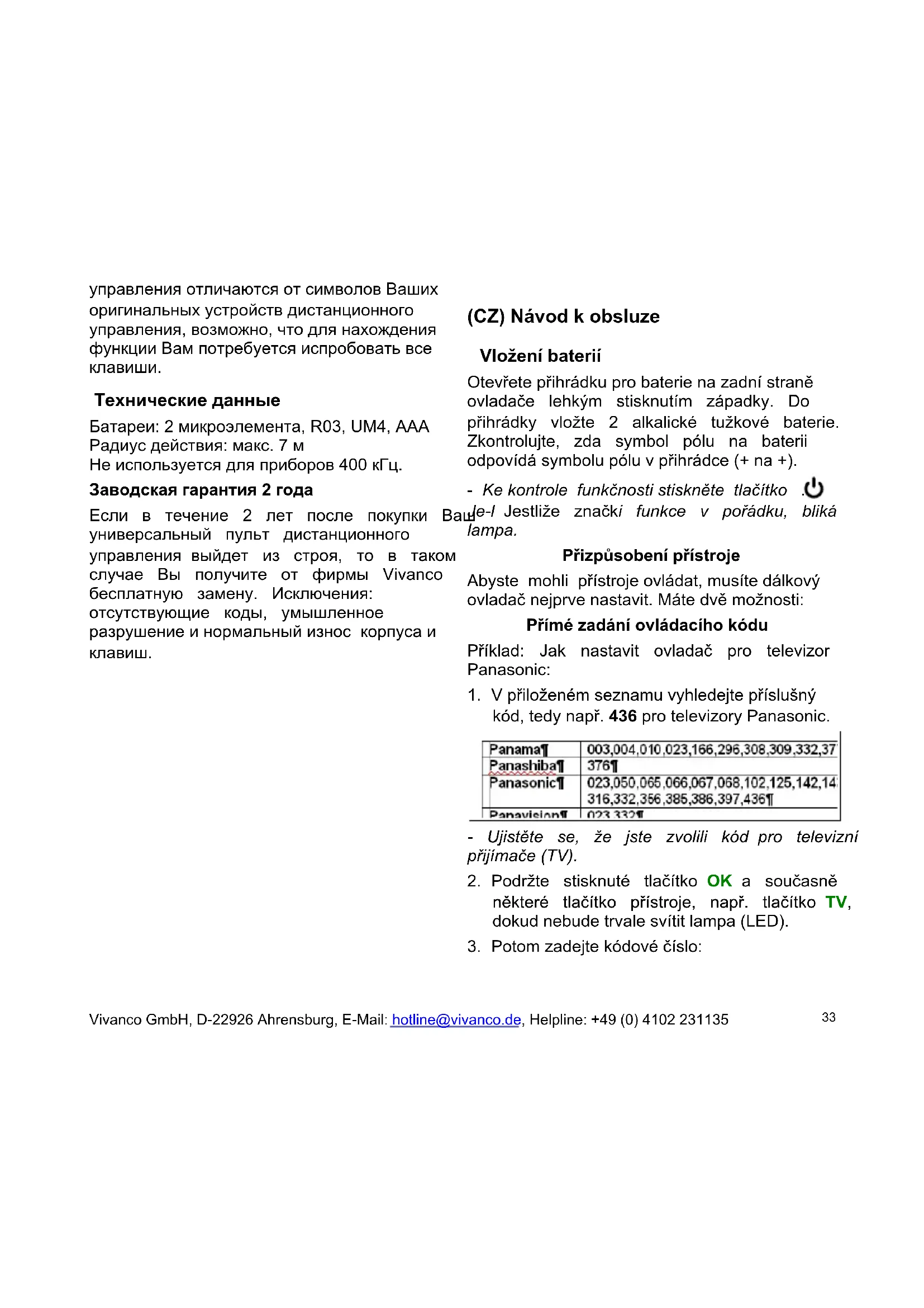 tlačítko OK+VOLUME+ a spočítejte, kolikrát blikne údaj stovek. Poté stiskněte krátce tlačítko OK+VOLUME- a spočítejte, kolikrát blikne údaj desítek. Nakonec stiskněte krátce tlačítko OK+CH/SKIPΔ a spočítejte, kolikrát blikne údaj jedniček. - V případě 0 údaj nebliká. Nastavení od výroby Podržíte-li stisknuté tlačítko OK+ tak dlouho, dokud nezačne blikat lampa 2*, pak se všechny nastavení vynulují na nastavení od výroby. Ovládání Přístroje ovládáte prakticky stejně jako pomocí originálních ovladačů. Symboly na ovladači uni- verzálního dálkového ovládání se mohou od symbolů na originálních ovladačích lišit, proto je třeba v některých případech vyzkoušet různá tlačítka při hledání určité funkce. Technické údaje Baterie: 2 tužkové baterie AAA, R03, UM4 Dosah: max. 7 m Nevhodný pro přístroje 400 kHz 2 roky záruka od výrobce Přestane-li ovladač s dálkovým ovládáním Vivanco GmbH, D-22926 Ahrensburg, E-Mail: hotline@vivanco.de, Helpline: +49 (0) 4102 231135 35kdykoli během 2 let od zakoupení fungovat, získáte od firmy Vivanco zdarma nový ovladač. Výjimka: chybějící kódy, úmyslné poškození a běžné opotřebení krytu a tlačítek. Vivanco GmbH, D-22926 Ahrensburg, E-Mail: hotline@vivanco.de, Helpline: +49 (0) 4102 231135