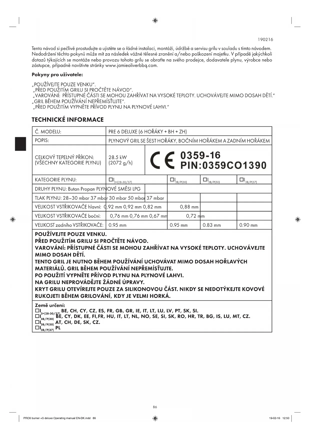 Tento návod si pečlivě prostudujte a ujistěte se o řádné instalaci, montáži, údržbě a servisu grilu v souladu s tímto návodem. Nedodržení těchto pokynů může mít za následek vážné tělesné zranění a/nebo poškození majetku. V případě jakýchkoli dotazů týkajících se montáže nebo provozu tohoto grilu se obraťte na svého prodejce, dodavatele plynu, výrobce nebo zástupce, případně navštivte stránky www.jamieoliverbbq.com. Pokyny pro uživatele: „POUŽÍVEJTE POUZE VENKU“. „PŘED POUŽITÍM GRILU SI PROČTĚTE NÁVOD“. „VAROVÁNÍ: PŘÍSTUPNÉ ČÁSTI SE MOHOU ZAHŘÍVAT NA VYSOKÉ TEPLOTY. UCHOVÁVEJTE MIMO DOSAH DĚTÍ.“ „GRIL BĚHEM POUŽÍVÁNÍ NEPŘEMÍSŤUJTE“. „PŘED POUŽITÍM VYPNĚTE PŘÍVOD PLYNU NA PLYNOVÉ LAHVI.“ TECHNICKÉ INFORMACE Č. MODELU: PRE 6 DELUXE (6 HOŘÁKY + BH + ZH) POPIS: PLYNOVÝ GRIL SE ŠEST HOŘÁKY, BOČNÍM HOŘÁKEM A ZADNÍM HOŘÁKEM CELKOVÝ TEPELNÝ PŘÍKON: (VŠECHNY KATEGORIE PLYNU)
