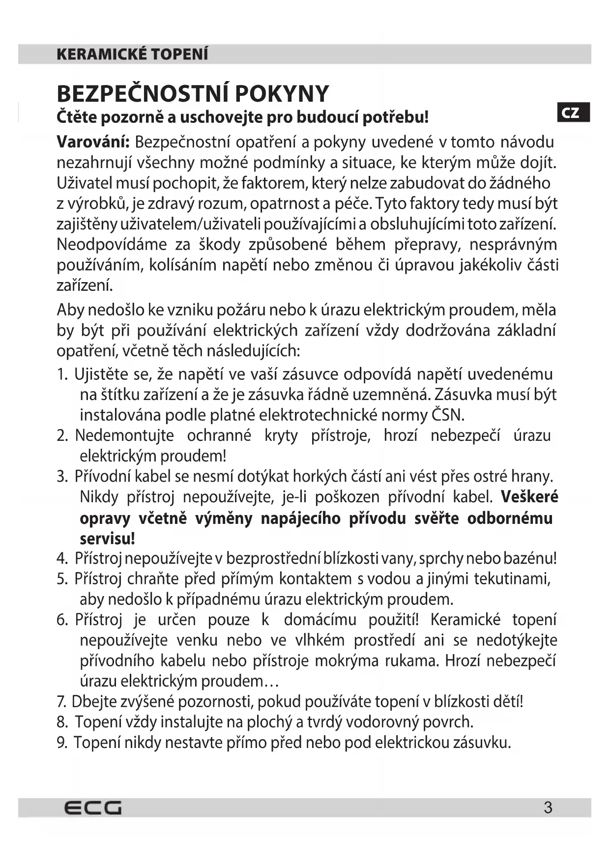 - Přístroj je určen pouze k domácímu použití! Keramické topení nepoužívejte venku nebo ve vlhkém prostředí ani se nedotýkejte přívodního kabelu nebo přístroje mokrýma rukama. Hrozí nebezpečí úrazu elektrickým proudem...