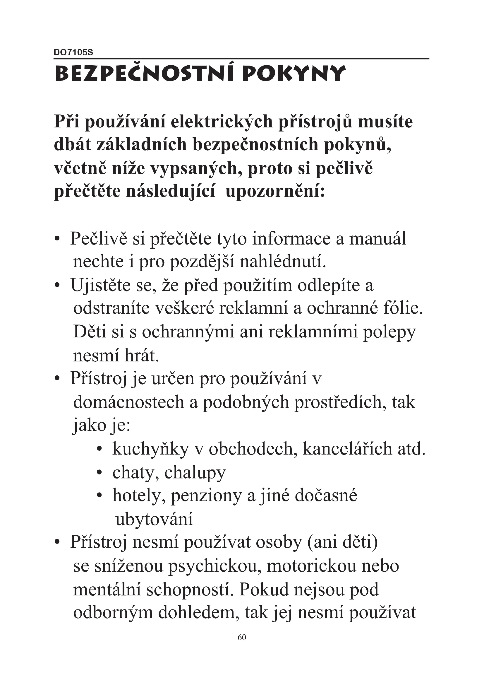 - Přístroj nesmí používat osoby (ani děti) se sníženou psychickou, motorickou nebo mentální schopností. Pokud nejsou pod odborným dohledem, tak jej nesmí používatDO7105S