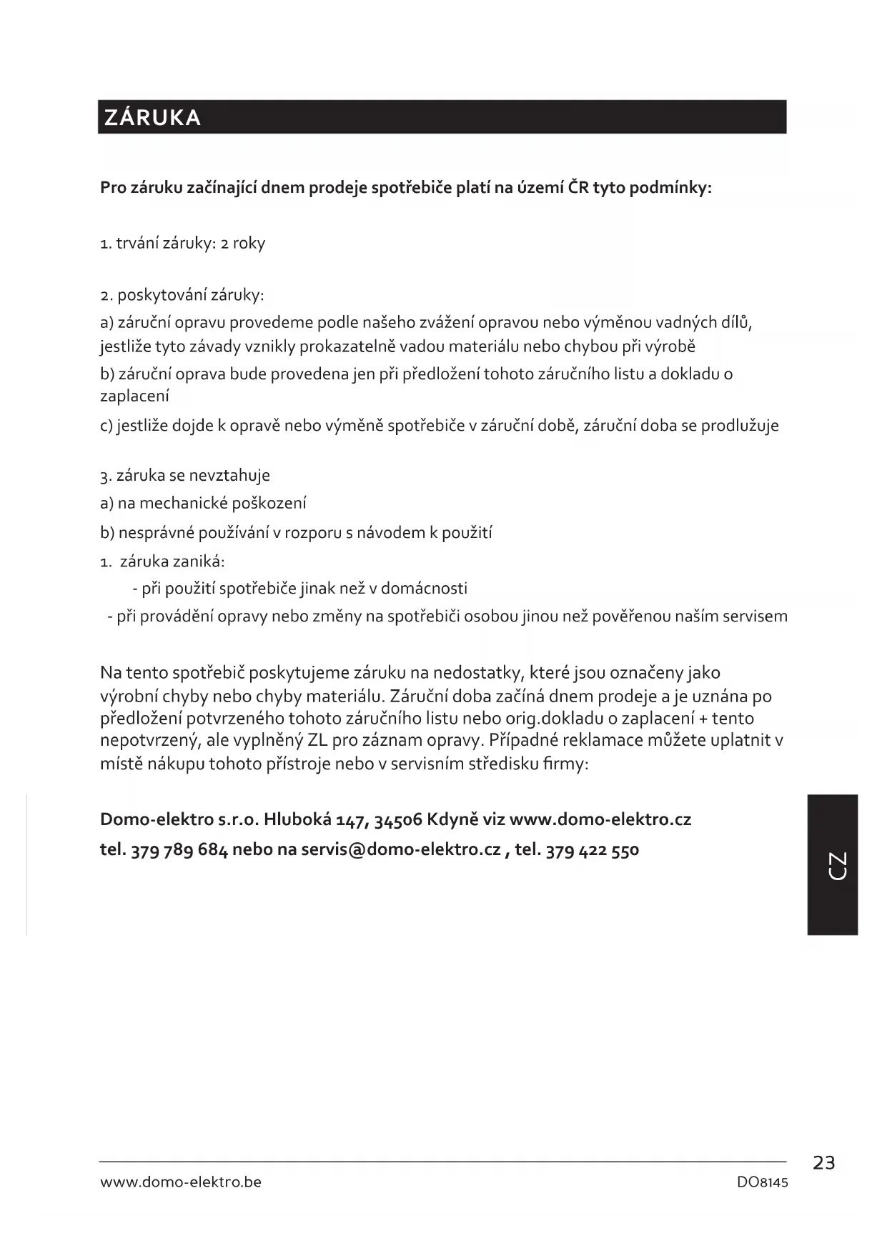 - při použití spotřebiče jinak než v domácnosti - při provádění opravy nebo změny na spotřebiči osobou jinou než pověřenou naším servisem Na tento spotřebič poskytujeme záruku na nedostatky, které jsou označeny jako výrobní chyby nebo chyby materiálu. Záruční doba začíná dnem prodeje a je uznána po předložení potvrzeného tohoto záručního listu nebo orig.dokladu o zaplacení + tento nepotvrzený, ale vyplněný ZL pro záznam opravy. Případné reklamace můžete uplatnit v místě nákupu tohoto přístroje nebo v servisním středisku rmy: Domo-elektro s.r.o. Hluboká 147, 34506 Kdyně viz www.domo-elektro.cz tel. 379 789 684 nebo na servis@domo-elektro.cz , tel. 379 422 55024 DO8145