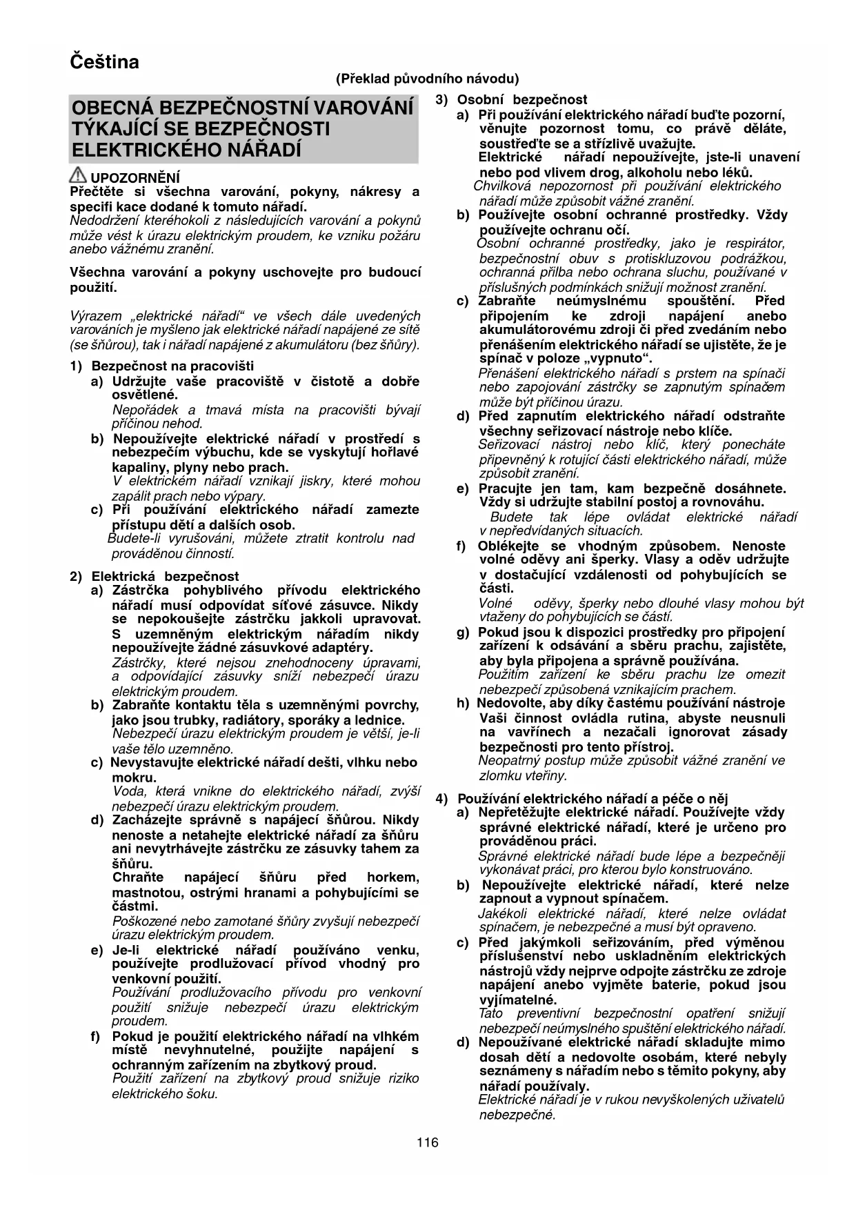 UPOZORNĚNÍ Přečtěte si všechna varování, pokyny, nákresy a specifi kace dodané k tomuto nářadí. Nedodržení kteréhokoli z následujících varování a pokynů může vést k úrazu elektrickým proudem, ke vzniku požáru anebo vážnému zranění. Všechna varování a pokyny uschovejte pro budoucí použití. Výrazem „elektrické nářadí“ ve všech dále uvedených varováních je myšleno jak elektrické nářadí napájené ze sítě (se šňůrou), tak i nářadí napájené z akumulátoru (bez šňůry).