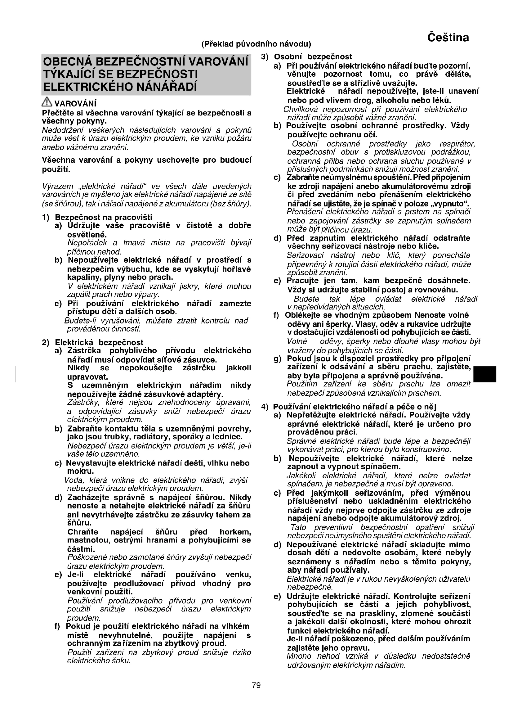 Vyrazem „elektrické načadi“ ve všech dale uvedenych varovánich je mysleno jak elektrické načadi napajné ze sítě (se šnúrou), tak i načadi napajné z akumulatoru (bez šnúry).