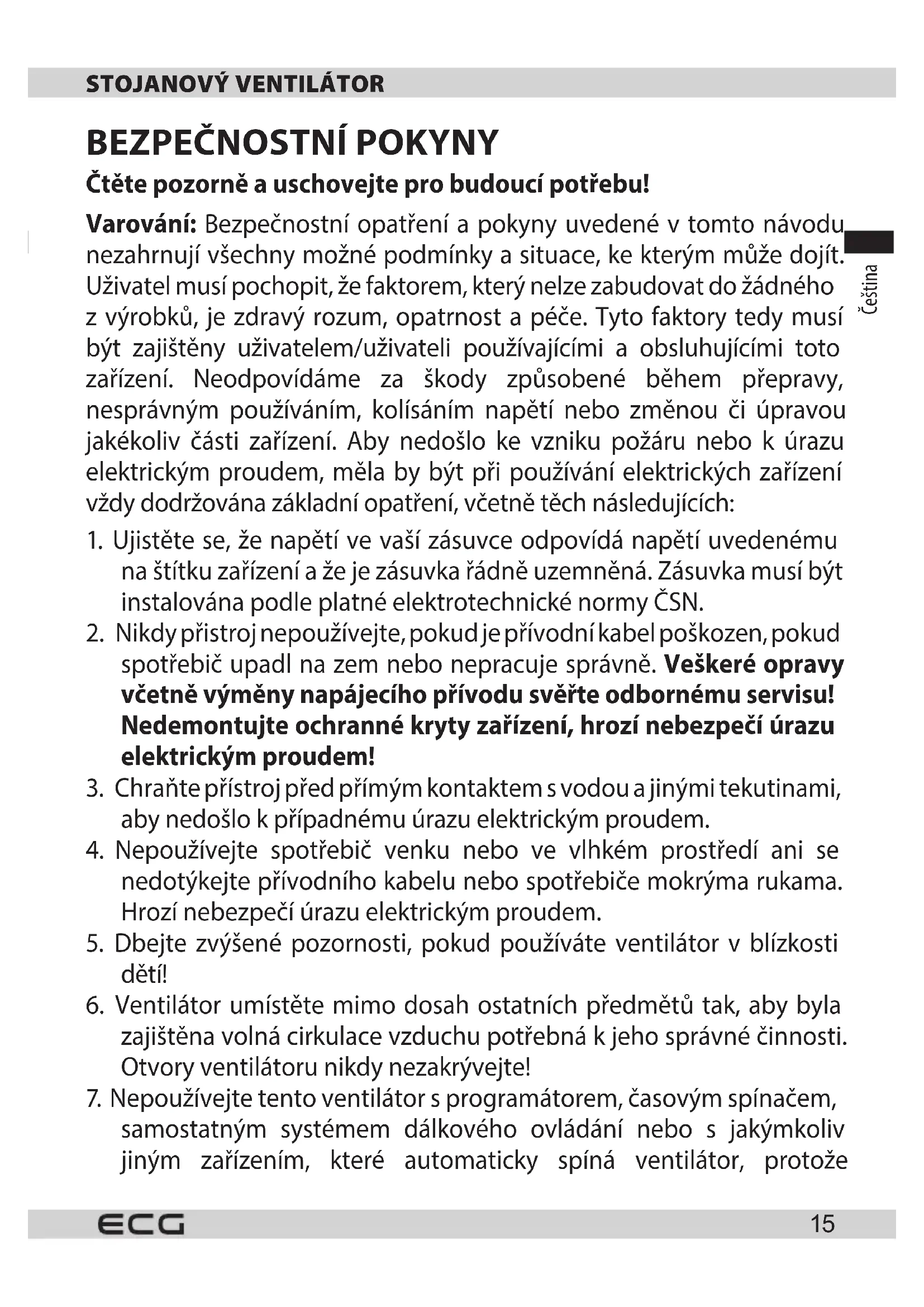 15. Používejte ventilátor pouze v souladu s pokyny uvedenými v tomto