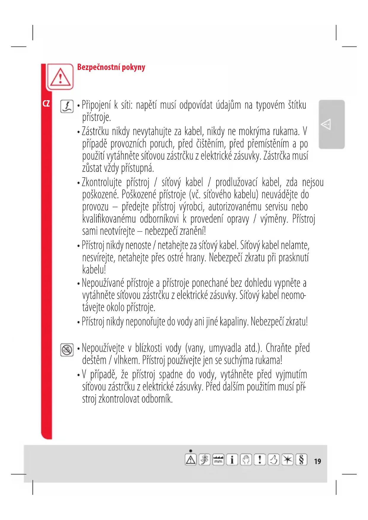 - Nepoužívejte v blízkosti vody (vany, umyvadla atd.). Chraňte před deštěm / vlhkem. Přístroj používejte jen se suchýma rukama!20 Bezpečnostní pokyny