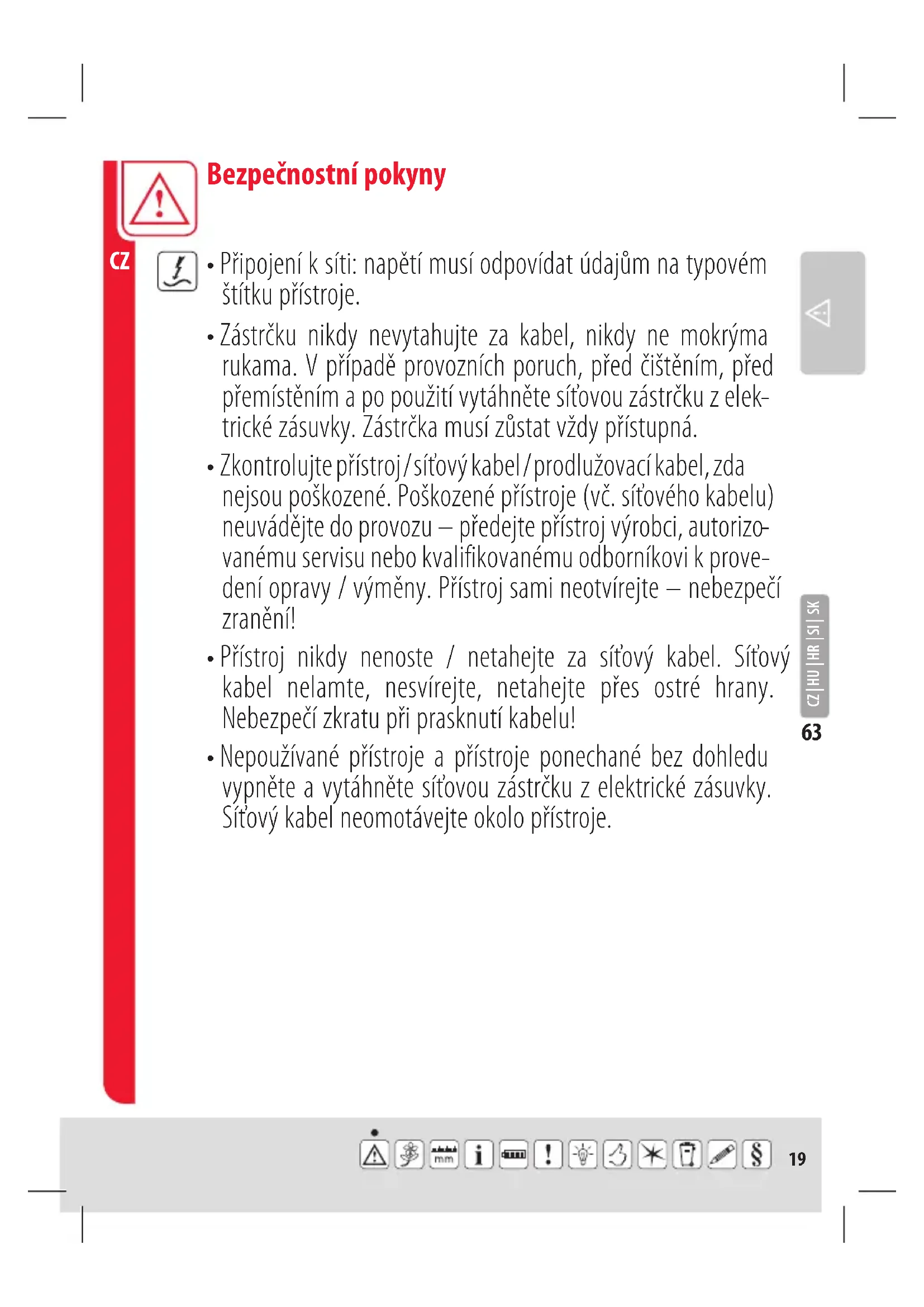 - Nepoužívané přístroje a přístroje ponechané bez dohledu vypněte a vytáhněte síťovou zástrčku z elektrické zásuvky. Síťový kabel neomotávejte okolo přístroje. Bezpečnostní pokyny20