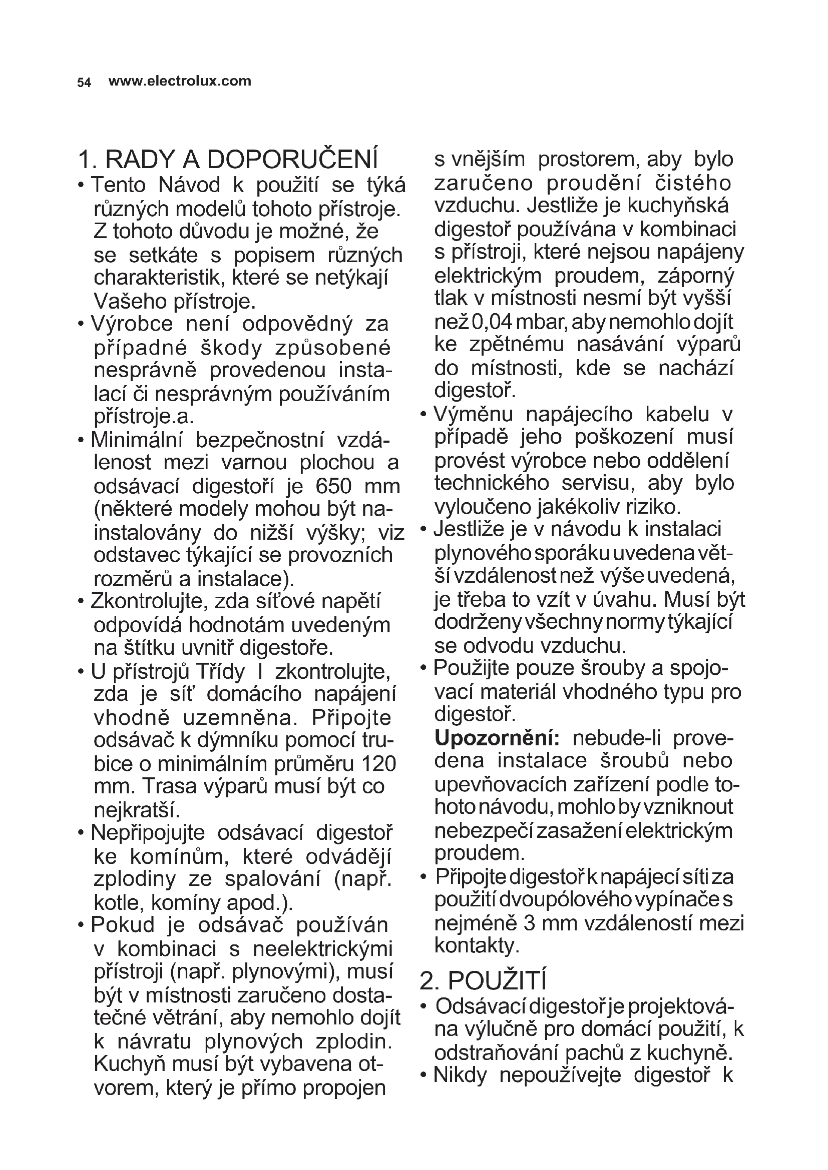 - Nikdy nepoužívejte digestoř k55 CZECH jiným účelům než k těm, pro které je určena.