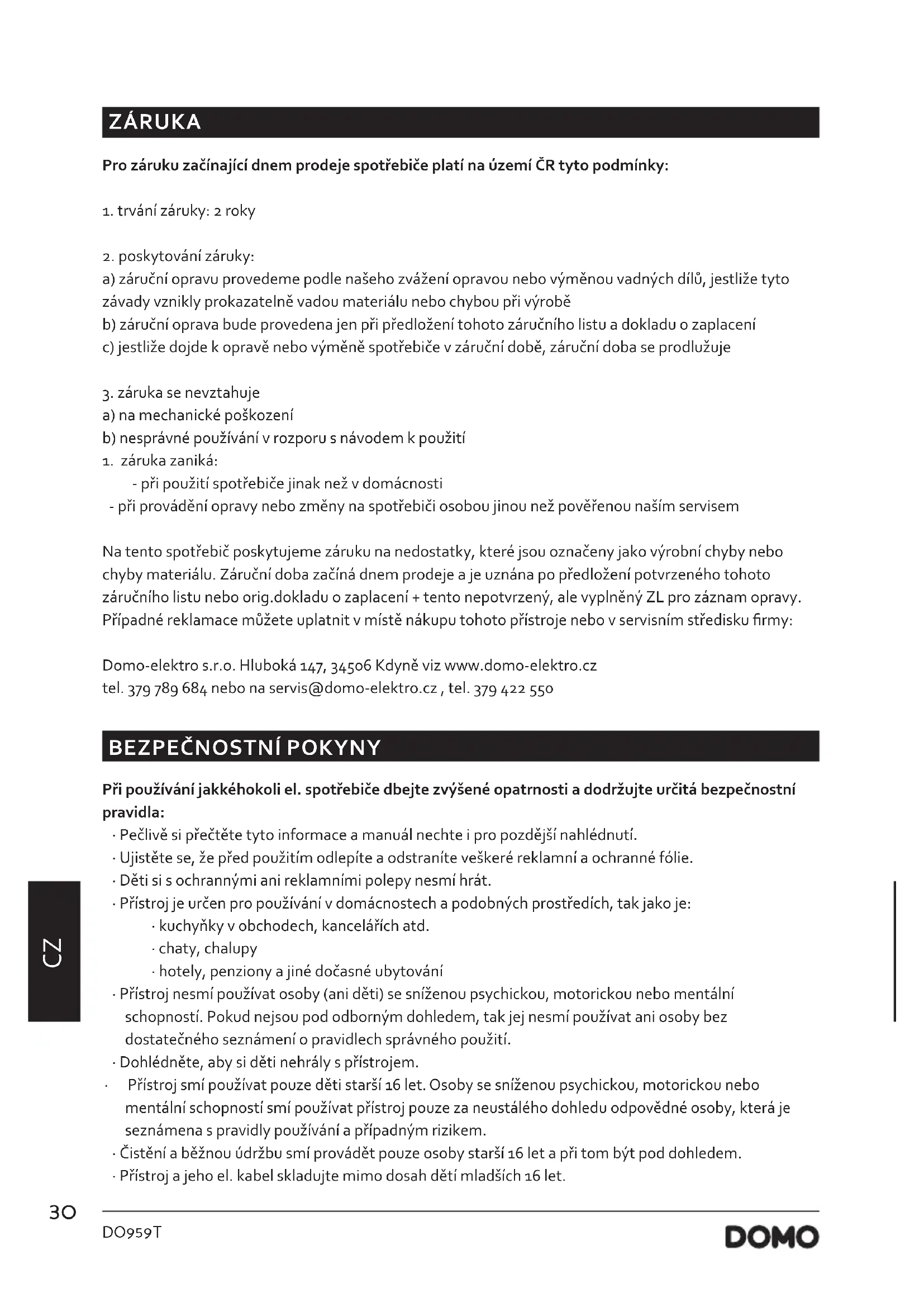 - při použití spotřebiče jinak než v domácnosti - při provádění opravy nebo změny na spotřebiči osobou jinou než pověřenou naším servisem Na tento spotřebič poskytujeme záruku na nedostatky, které jsou označeny jako výrobní chyby nebo chyby materiálu. Záruční doba začíná dnem prodeje a je uznána po předložení potvrzeného tohoto záručního listu nebo orig.dokladu o zaplacení + tento nepotvrzený, ale vyplněný ZL pro záznam opravy. Případné reklamace můžete uplatnit v místě nákupu tohoto přístroje nebo v servisním středisku rmy: Domo-elektro s.r.o. Hluboká 147, 34506 Kdyně viz www.domo-elektro.cz tel. 379 789 684 nebo na servis@domo-elektro.cz , tel. 379 422 550