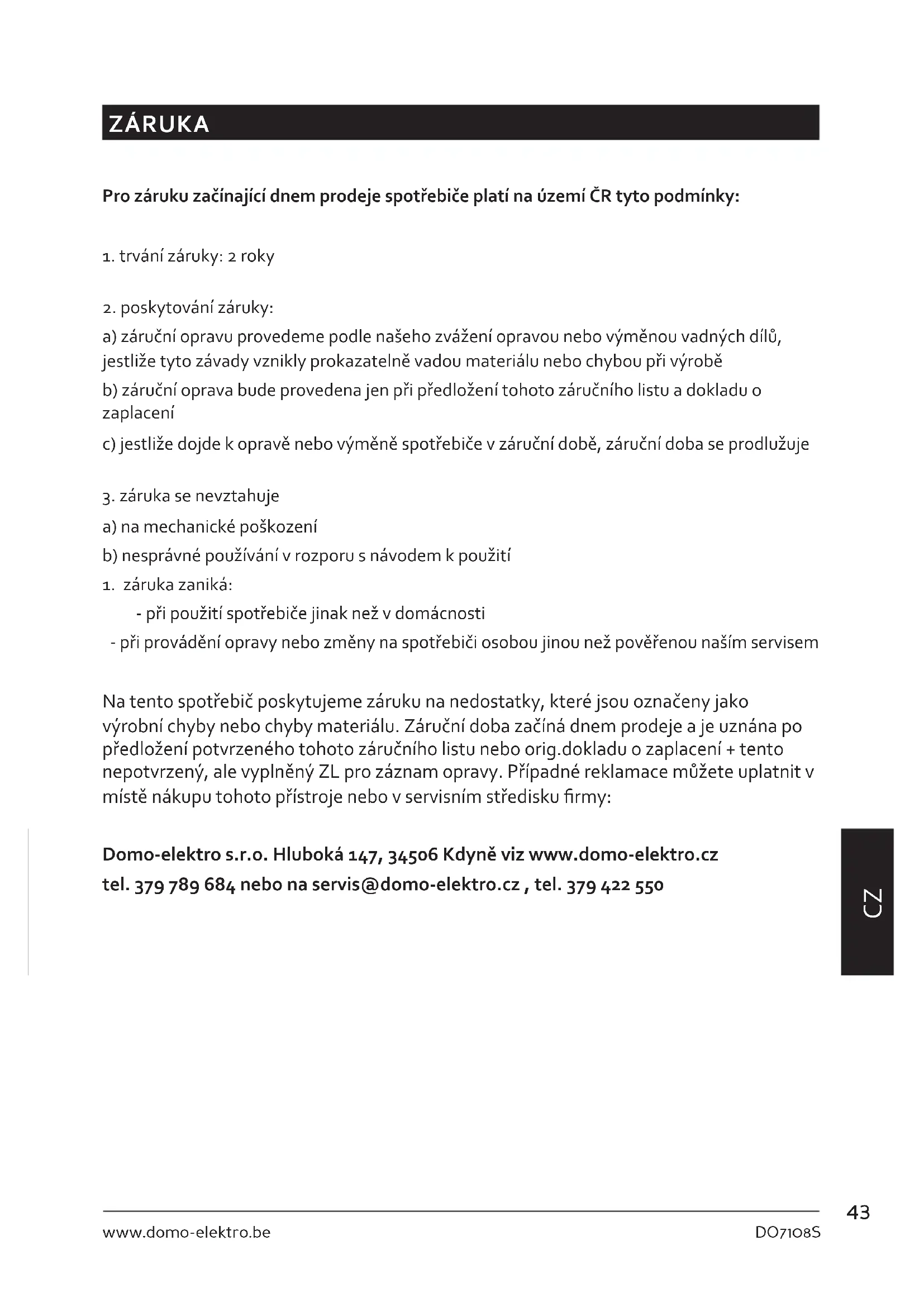 ZÁRUKA Pro záruku začínající dnem prodeje spotřebiče platí na území ČR tyto podmínky: