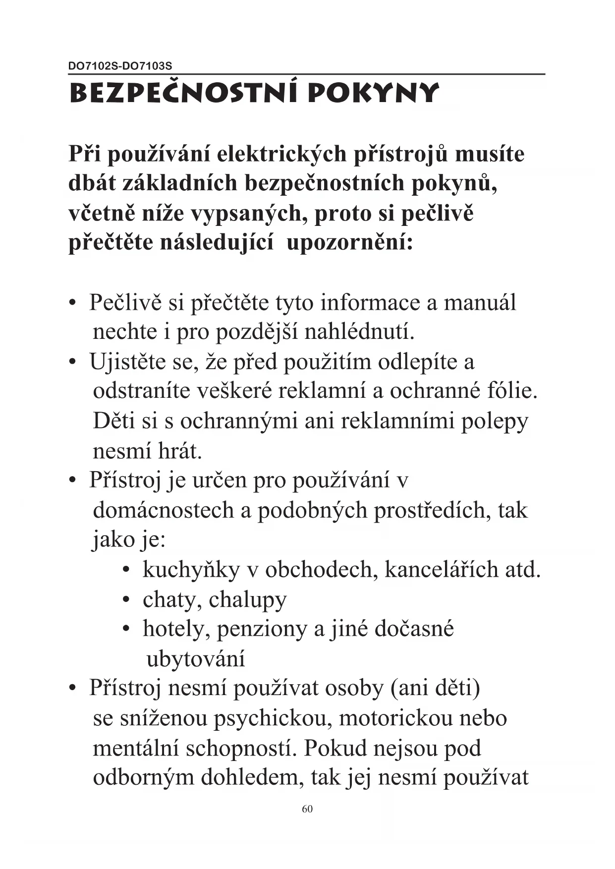 - Přístroj nesmí používat osoby (ani děti) se sníženou psychickou, motorickou nebo mentální schopností. Pokud nejsou pod odborným dohledem, tak jej nesmí používatDO7102S-DO7103S