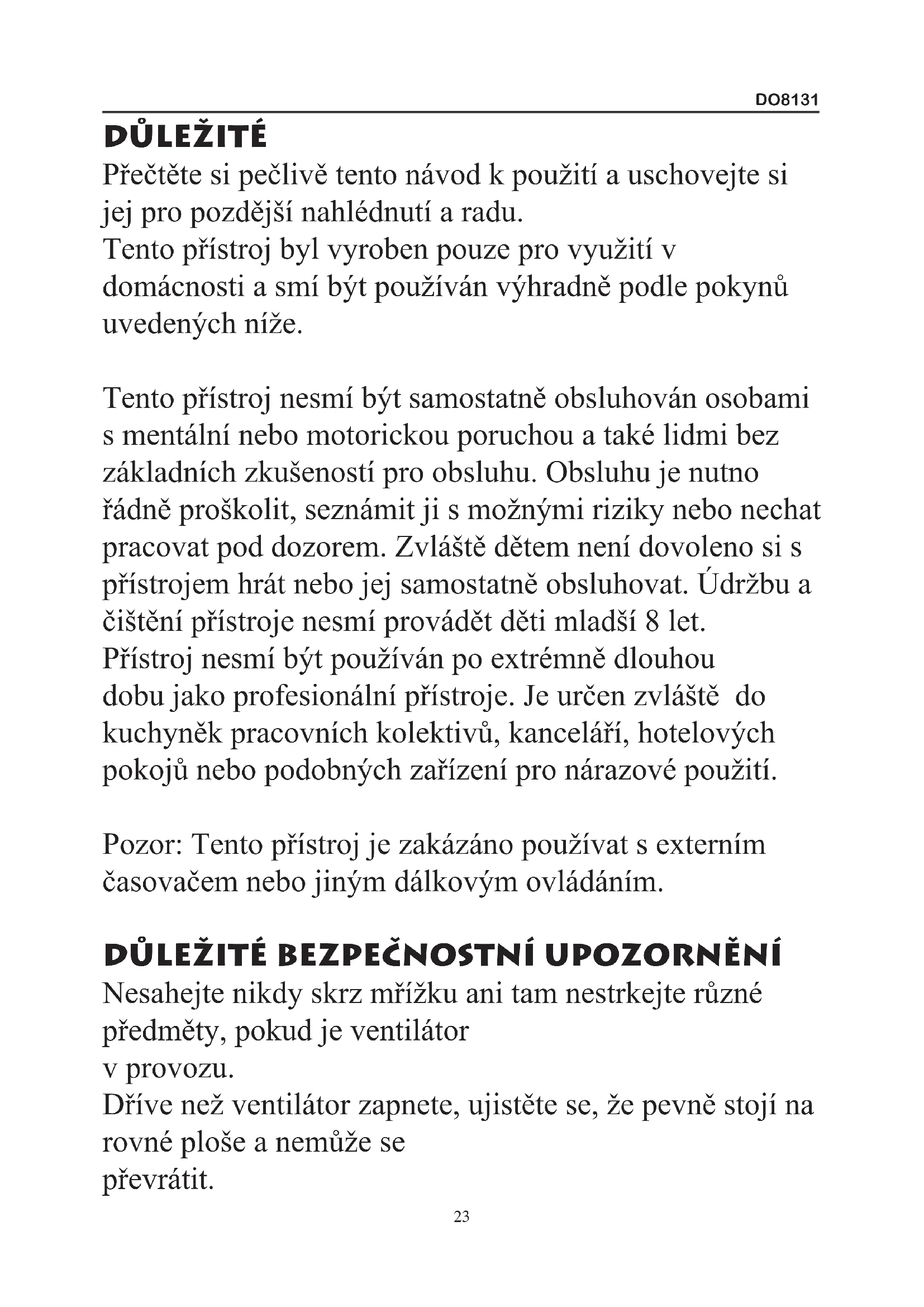 DŮLEŽITé Přečtěte si pečlivě tento návod k použití a uschovejte si jej pro pozdější nahlédnutí a radu. Tento přístroj byl vyroben pouze pro využití v domácnosti a smí být používán výhradně podle pokynů uvedených níže. Tento přístroj nesmí být samostatně obsluhován osobami s mentální nebo motorickou poruchou a také lidmi bez základních zkušeností pro obsluhu. Obsluhu je nutno řádně proškolit, seznámit ji s možnými riziky nebo nechat pracovat pod dozorem. Zvláště dětem není dovoleno si s přístrojem hrát nebo jej samostatně obsluhovat. Údržbu a čištění přístroje nesmí provádět děti mladší 8 let. Přístroj nesmí být používán po extrémně dlouhou dobu jako profesionální přístroje. Je určen zvláště do kuchyněk pracovních kolektivů, kanceláří, hotelových pokojů nebo podobných zařízení pro nárazové použití. Pozor: Tento přístroj je zakázáno používat s externím časovačem nebo jiným dálkovým ovládáním. DŮLEŽITé BEZPEČNOSTNÍ UPOZORNĚNÍ Nesahejte nikdy skrz mřížku ani tam nestrkejte různé předměty, pokud je ventilátor v provozu. Dříve než ventilátor zapnete, ujistěte se, že pevně stojí na rovné ploše a nemůže se převrátit.DO8131