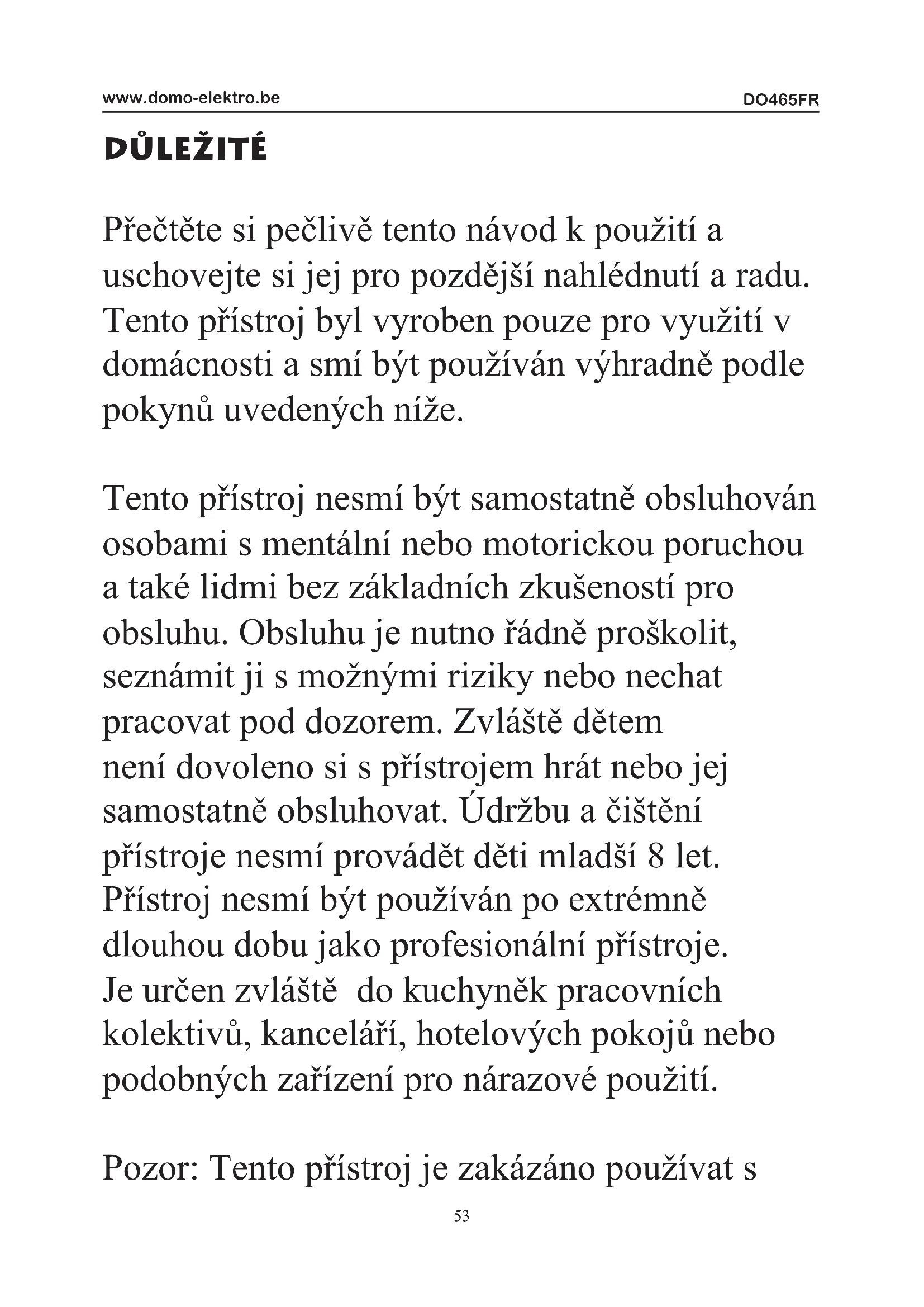 Tento prístroj nesmí byt samostatné obsluhován osobami s mentalní nebo motorickou poruchou a také lidmi bez základnich zkušenosti pro obsluhu. Obluhu je nutno rǎdně proškolit, seznámit ji s možnými rizíky nebo nechat pracovat pod dozorem. Zvlástě dětem není dovoleno si s prístrojem hrát nebo jej samostatné obsluhovat. Udržbu a Čištěné prístroje nesmí provadět déti mladů 8 let. Prístroj nesmí byt používan po extrémné dlouhou dobu jako profesonálné prístroje. Je určen zvlástě do kuchyněk pracovních kolektivů, kanceláří, hotelovych pokojů nebo podobněch zařizení pro nárazové použití.