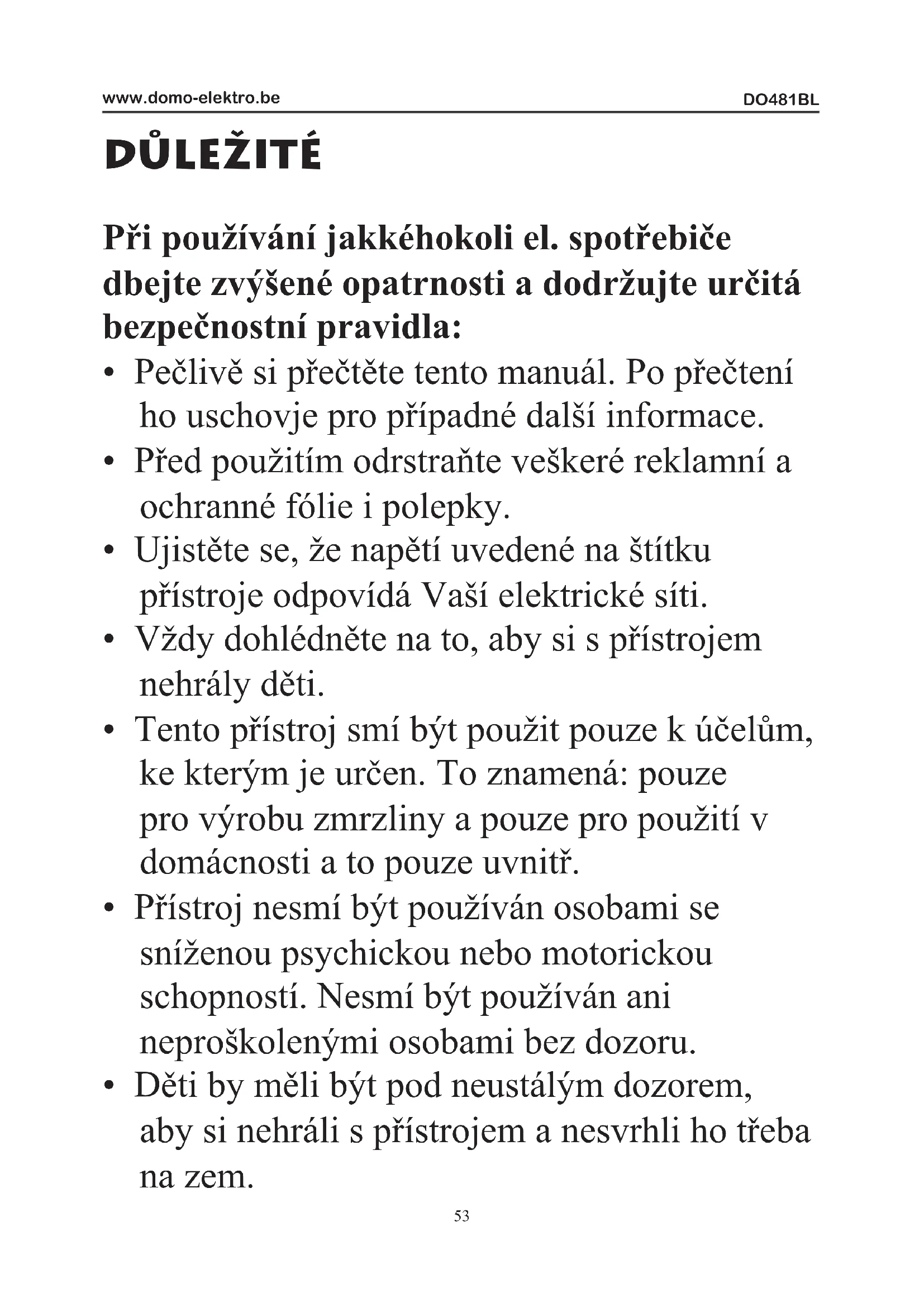- Děti starší 16 let, osoby se sníženou psychickou či koordinační schopnosti smí přístroj používat pouze za dozoru lidí, které jsou seznámeny s tímto manuálem i riziky. Děti nad 8 let smí přístroj pouze čistit, a to za předpokladu neustáleho dozoru. Přístroj při čistění musí být odpojen z el. proudu.