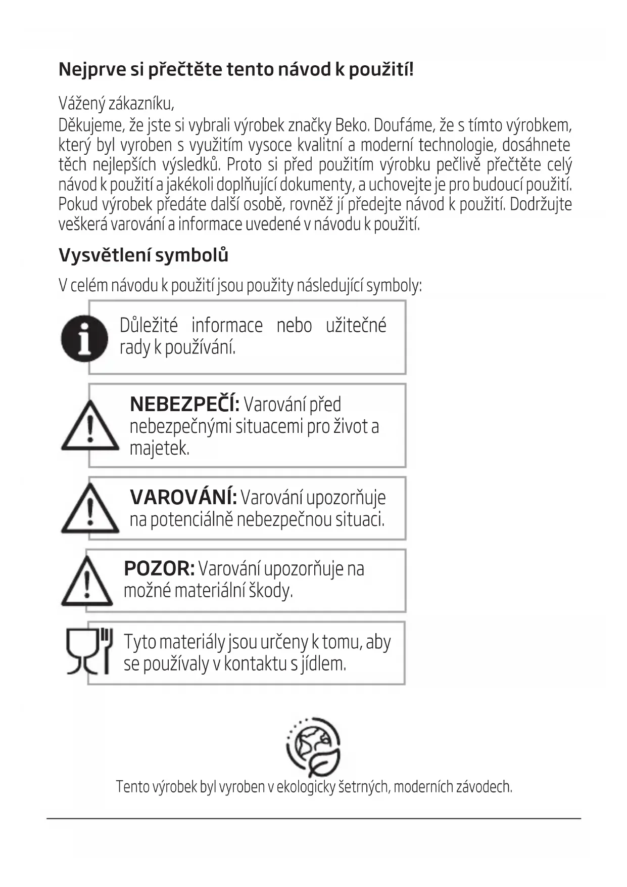 Nejprve si přečtěte tento návod k použití! Vážený zákazníku, Děkujeme, že jste si vybrali výrobek značky Beko. Doufáme, že s tímto výrobkem, který byl vyroben s využitím vysoce kvalitní a moderní technologie, dosáhnete těch nejlepších výsledků. Proto si před použitím výrobku pečlivě přečtěte celý návod k použití a jakékoli doplňující dokumenty, a uchovejte je pro budoucí použití. Pokud výrobek předáte další osobě, rovněž jí předejte návod k použití. Dodržujte veškerá varování a informace uvedené v návodu k použití. Vysvětlení symbolů V celém návodu k použití jsou použity následující symboly: Důležté nformace nebo užtečné rady k používání. NEBEZPEČÍ: Varování před nebezpečným stuacem pro žvot a majetek. VAROVÁNÍ: Varování upozorňuje na potencálně nebezpečnou stuac. POZOR: Varování upozorňuje na možné materální škody. Tyto materály jsou určeny k tomu, aby se používaly v kontaktu s jídlem. Tento výrobek byl vyroben v ekologicky šetrných, moderních závodech.1. Vnější odkapávací miska