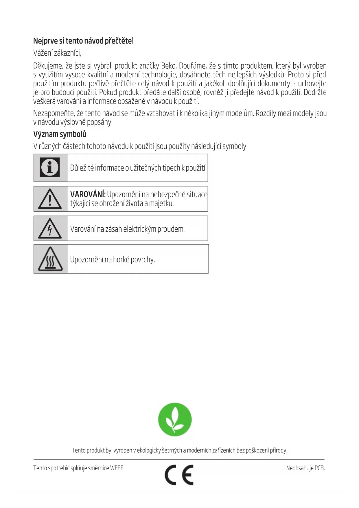 ПРЕДУПРЕЖДЕНИЕ: Преди да докоснете крушките, се уверете, че са изстинали. Свържете се упълномощен сервизен агент за смяна на лампата.Tento produkt byl vyroben v ekologicky šetrných a moderních zařízeních bez poškození přírody. Tento spotřebič splňuje směrnice WEEE. Neobsahuje PCB. Nejprve si tento návod přečtěte! Vážení zákazníci, Děkujeme, že jste si vybrali produkt značky Beko. Doufáme, že s tímto produktem, který byl vyroben s využitím vysoce kvalitní a moderní technologie, dosáhnete těch nejlepších výsledků. Proto si před použitím produktu pečlivě přečtěte celý návod k použití a jakékoli doplňující dokumenty a uchovejte je pro budoucí použití. Pokud produkt předáte další osobě, rovněž jí předejte návod k použití. Dodržte veškerá varování a informace obsažené v návodu k použití. Nezapomeňte, že tento návod se může vztahovat i k několika jiným modelům. Rozdíly mezi modely jsou v návodu výslovně popsány. Význam symbolů V různých částech tohoto návodu k použití jsou použity následující symboly: