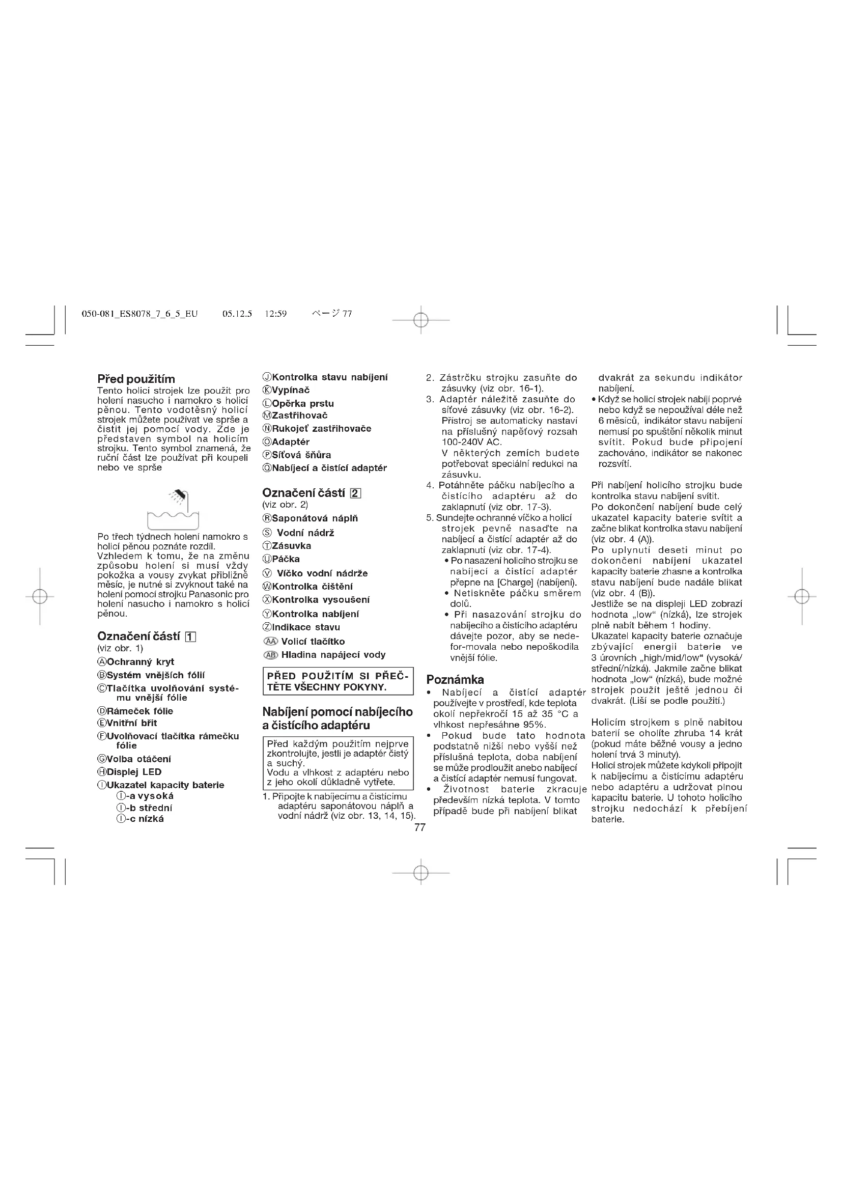 050-081ES8078765EU 05.12.5 12:59 ページ77Holení namokro Naneste na obličej tenkou vrstvu holicí pěny, která působí jako smáčedlo (snižuje tření). Je daleko výhodnější používat pěnu na holení než jiné holicí prostředky (gel, mýdlo, pasta atd.). Dbejte, aby vrstva nebyla příliš silná. V opačném případě se sníží výkon strojku. Dojde-li k zanesení holicí hlavy pěnou, opláchněte ji pod tekoucí vodou. Použití zastřihovače (viz obr. 9) Vysunutím držadla zastřihovač otevřete. Zastřihovač přiložte kolmo k pokožce a pohybem dolů zastříhněte kotlety. Čistění holicího strojku 1 Čištění pomocí nabíjecího a čistícího adaptéru Příprava nabíjecího a čistícího adaptéru Varování – adaptér nebo nabíjecí a čistící adaptér nemyjte vodou. Nedodržení tohoto pokynu může vést k úrazu elektrickým proudem nebo ke zkratům.