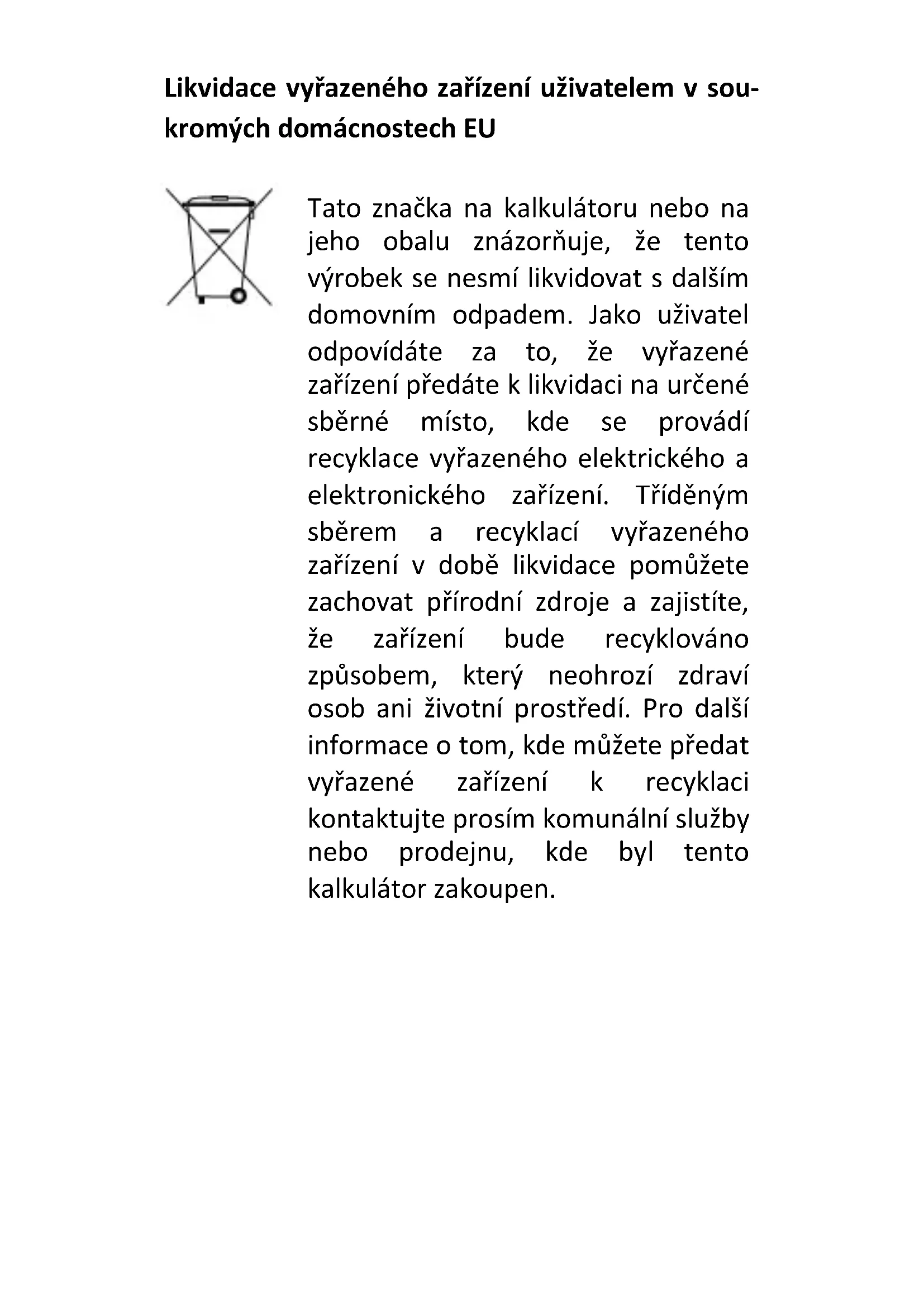 - Tato značka na kalkulátoru nebo na jeho obalu znázorňuje, že tento výrobek se nesmí likvidovat s dalším domovním odpadem. Jako uživatel odpovídáte za to, že vyřazené zařízení předáte k likvidaci na určené sběrné místo, kde se provádí recyklace vyřazeného elektrického a elektronického zařízení. Tříděným sběrem a recyklací vyřazeného zařízení v době likvidace pomůžete zachovat přírodní zdroje a zajistíte, že zařízení bude recyklováno způsobem, který neohrozí zdraví osob ani životní prostředí. Pro další informace o tom, kde můžete předat vyřazené zařízení k recyklaci kontaktujte prosím komunální služby nebo prodejnu, kde byl tento kalkulátor zakoupen.Obsah Před použitím kalkulátoru p. 1
