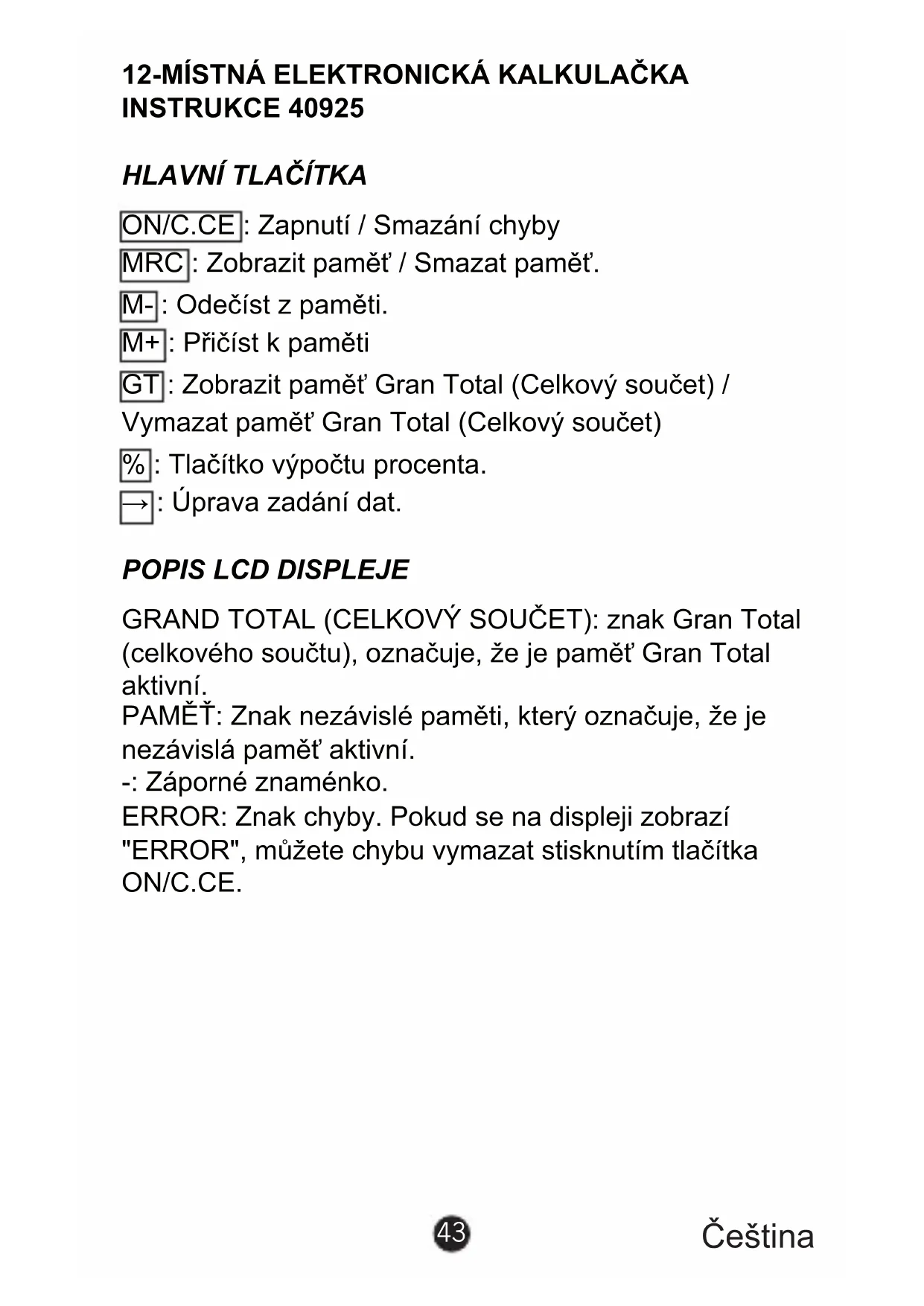 GRAND TOTAL (CELKOVÝ SOUČET): znak Gran Total (celkového součtu), označuje, že je paměť Gran Total aktivní. PAMĚŤ: Znak nezávislé paměti, který označuje, že je nezávislá paměť aktivní. -: Záporné znaménko. ERROR: Znak chyby. Pokud se na displeji zobrazí "ERROR", můžete chybu vymazat stisknutím tlačítka ON/C.CE.
