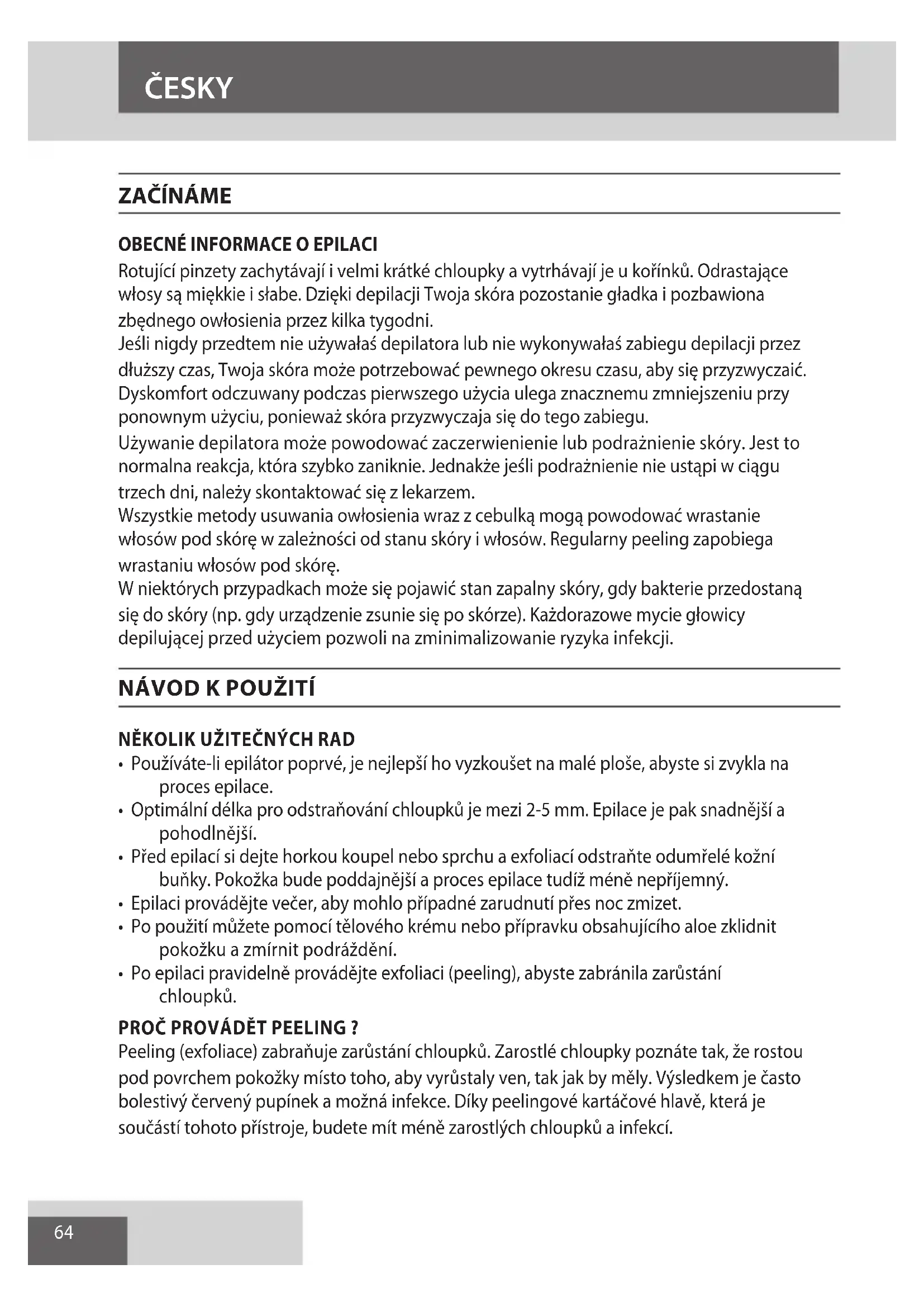 - Po epilaci pravidelně provádějte exfoliaci (peeling), abyste zabránila zarůstání chloupků. PROČ PROVÁDĚT PEELING ? Peeling (exfoliace) zabraňuje zarůstání chloupků. Zarostlé chloupky poznáte tak, že rostou pod povrchem pokožky místo toho, aby vyrůstaly ven, tak jak by měly. Výsledkem je často bolestivý červený pupínek a možná infekce. Díky peelingové kartáčové hlavě, která je součástí tohoto přístroje, budete mít méně zarostlých chloupků a infekcí. ČESKY65 ČESKY