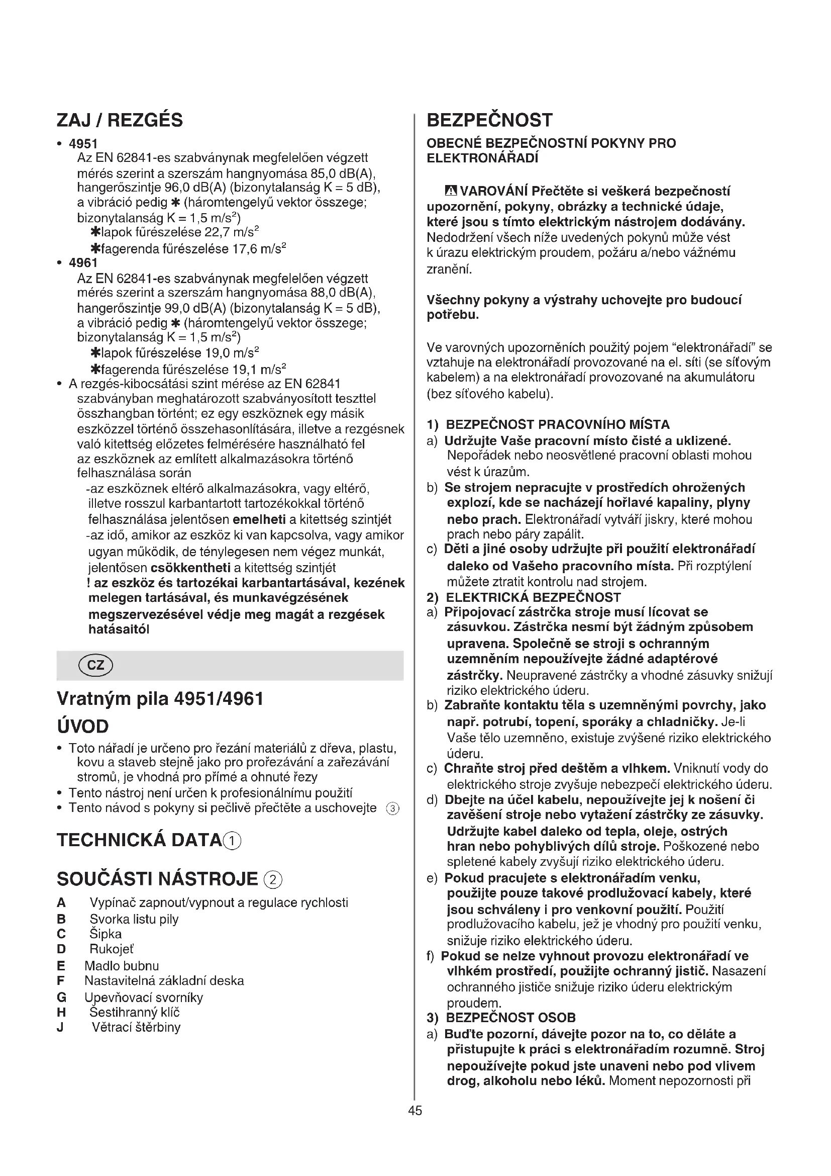 - 4951 Při měření v souladu s normou EN 62841 je hladina akustického tlaku tohoto nástroje 85,0 dB(A) a hladina hlučnosti 96,0 dB(A) (nepřesnost K = 5 dB), a vibrace ✱ (celkové hodnoty vibrací; nepřesnost K = 1,5 m/s²) ✱ řezání desky 22,7 m/s² ✱ řezání dřevěného trámu 17,6 m/s²