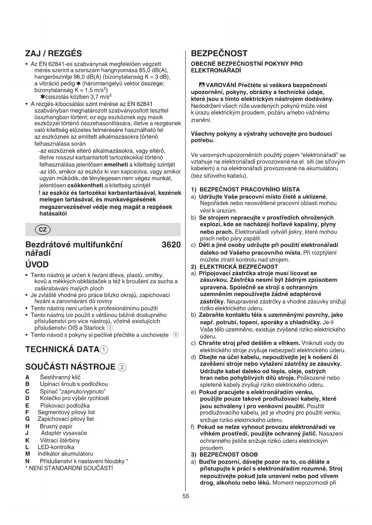 A Šestihranný klíč B Upínací šroub s podložkou C Spínač “zapnuto/vypnuto” D Kolečko pro výběr rychlosti E Pískovací podložka F Segmentový pilový list G Zapichovací pilový list H Brusný papír J Adaptér vysavače K Větrací štěrbiny L LED-kontrolka M Indikátor akumulátoru N Příslušenství k nastavení hloubky *