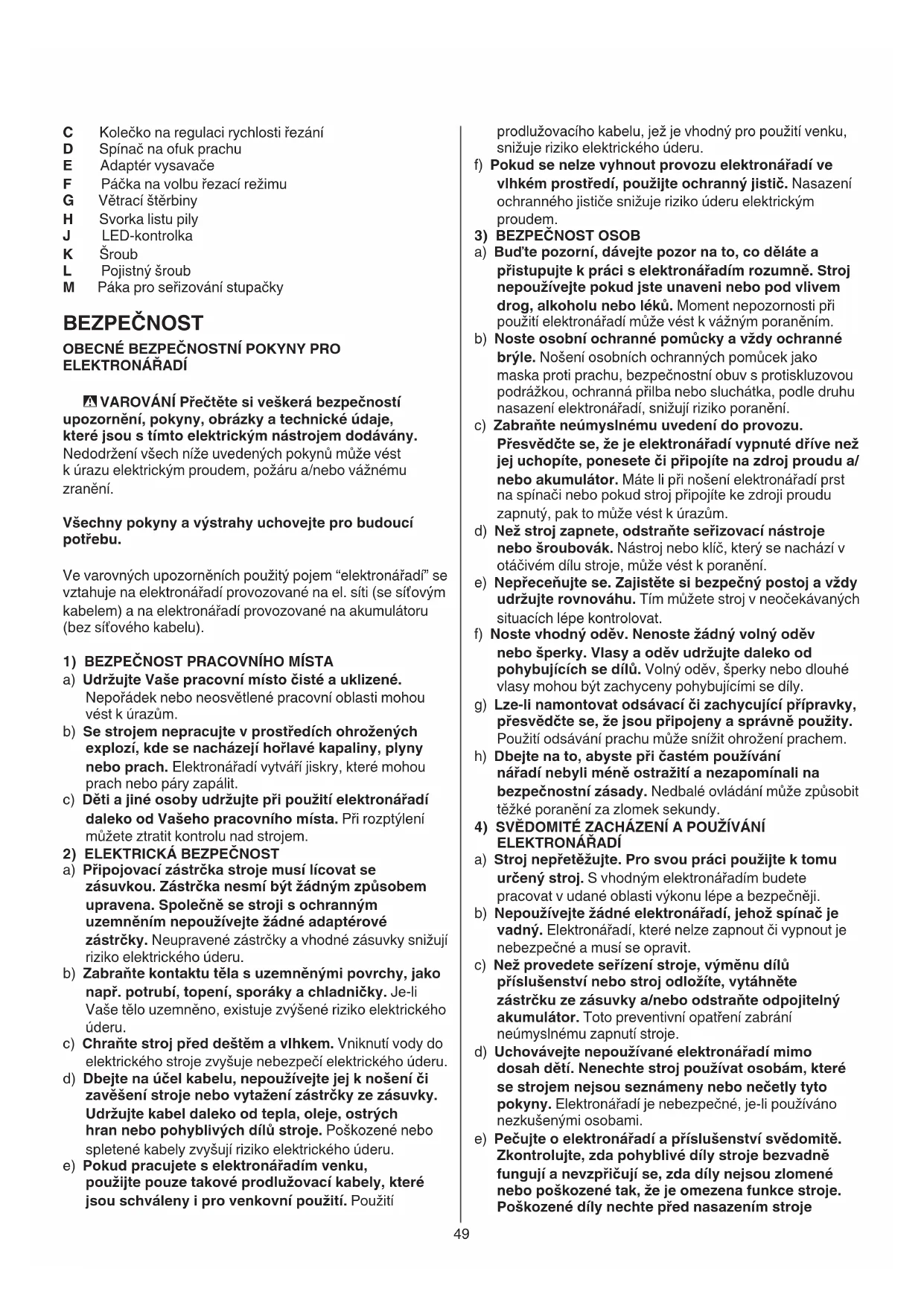 ELEKTRONÁŘADÍ a) Stroj nepřetěžujte. Pro svou práci použijte k tomu určený stroj. S vhodným elektronářadím budete pracovat v udané oblasti výkonu lépe a bezpečněji. b) Nepoužívejte žádné elektronářadí, jehož spínač je vadný. Elektronářadí, které nelze zapnout či vypnout je nebezpečné a musí se opravit. c) Než provedete seřízení stroje, výměnu dílů příslušenství nebo stroj odložíte, vytáhněte zástrčku ze zásuvky a/nebo odstraňte odpojitelný akumulátor. Toto preventivní opatření zabrání neúmyslnému zapnutí stroje. d) Uchovávejte nepoužívané elektronářadí mimo dosah dětí. Nenechte stroj používat osobám, které se strojem nejsou seznámeny nebo nečetly tyto pokyny. Elektronářadí je nebezpečné, je-li používáno nezkušenými osobami. e) Pečujte o elektronářadí a příslušenství svědomitě. Zkontrolujte, zda pohyblivé díly stroje bezvadně fungují a nevzpřičují se, zda díly nejsou zlomené nebo poškozené tak, že je omezena funkce stroje. Poškozené díly nechte před nasazením stroje C Kolečko na regulaci rychlosti řezání D Spínač na ofuk prachu E Adaptér vysavače F Páčka na volbu řezací režimu G Větrací štěrbiny H Svorka listu pily J LED-kontrolka K Šroub L Pojistný šroub M Páka pro seřizování stupačky BEZPEČNOST