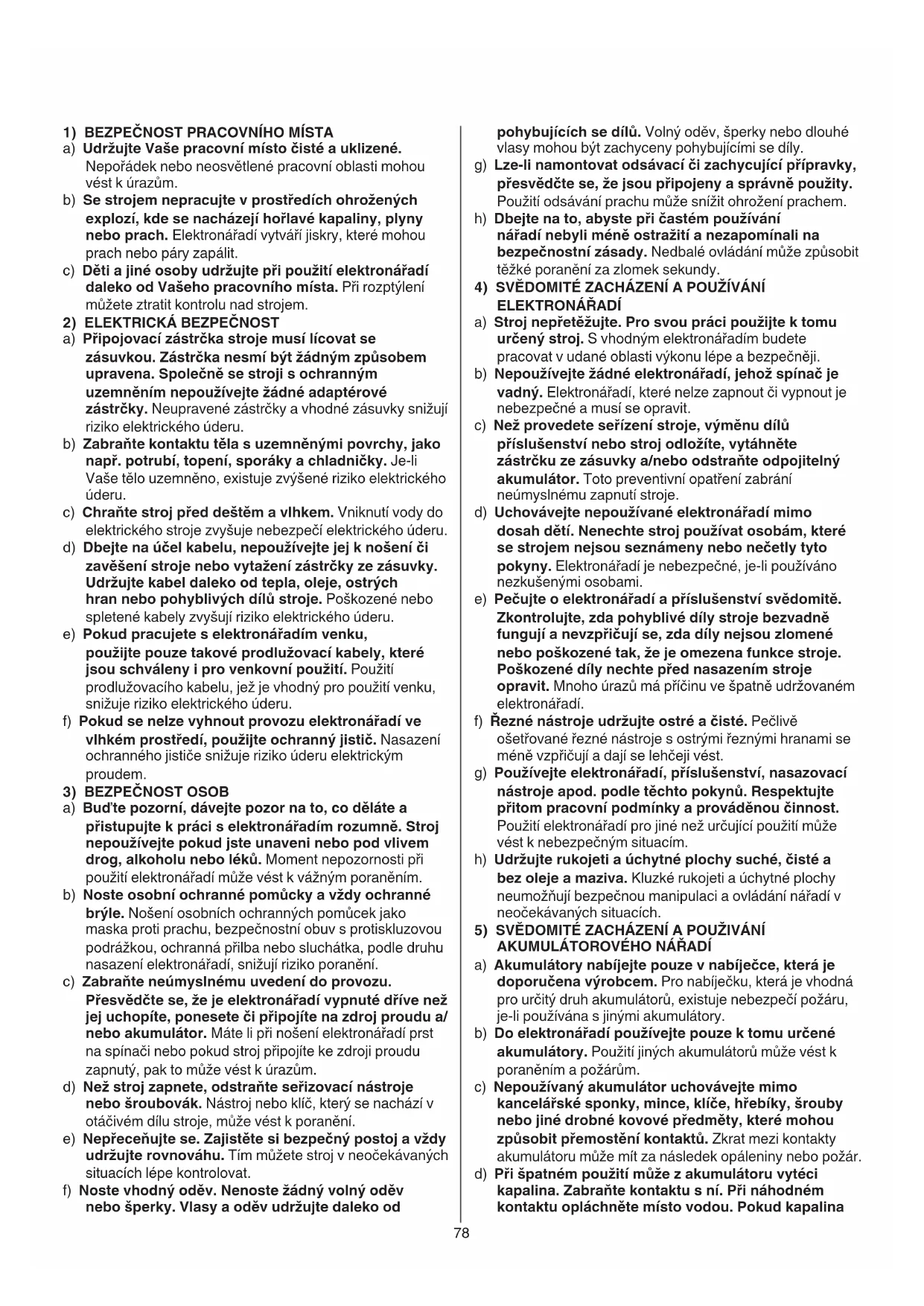 ELEKTRONÁŘADÍ - VAROVÁNÍ Přečtěte si veškerá bezpečností upozornění, pokyny, obrázky a technické údaje, které jsou s tímto elektrickým nástrojem dodávány. Nedodržení všech níže uvedených pokynů může vést k úrazu elektrickým proudem, požáru a/nebo vážnému zranění. Všechny pokyny a výstrahy uchovejte pro budoucí potřebu. Ve varovných upozorněních použitý pojem “elektronářadí” se vztahuje na elektronářadí provozované na el. síti (se síťovým kabelem) a na elektronářadí provozované na akumulátoru (bez síťového kabelu).
