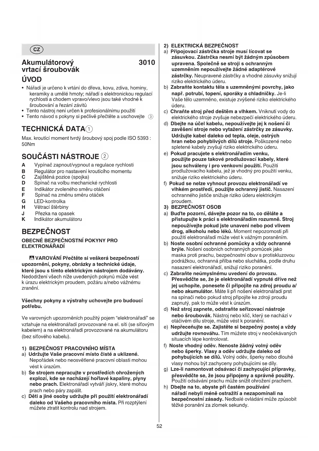 A Vypínač zapnout/vypnout a regulace rychlosti B Regulátor pro nastavení kroutícího momentu C Zajištěná pozice (spojka) D Spínač na volbu mechanické rychlosti E Indikátor zvoleného směru otáčení F Spínač na změnu směru otáček G LED-kontrolka H Větrací štěrbiny J Přezka na opasek K Indikátor akumulátoru BEZPEČNOST