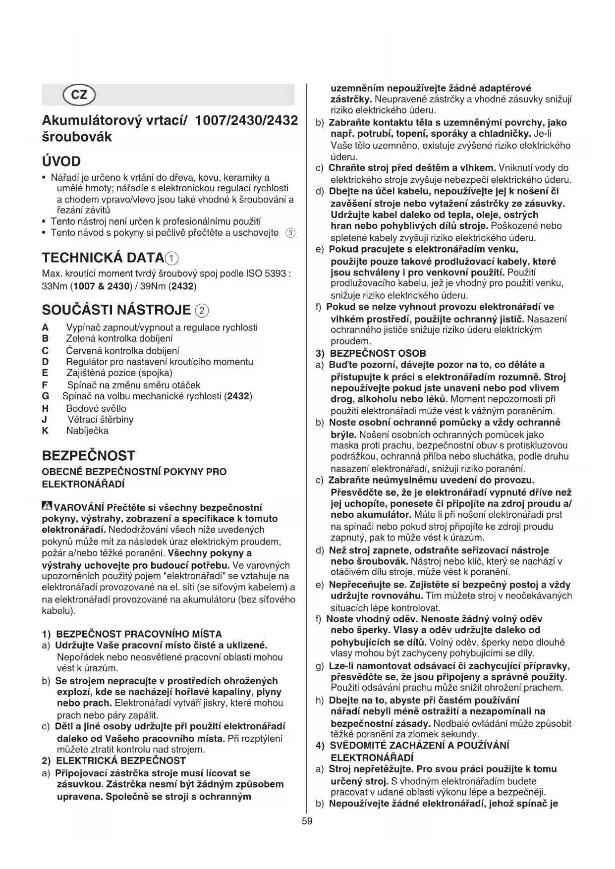 A Vypínač zapnout/vypnout a regulace rychlosti B Zelená kontrolka dobíjení C Červená kontrolka dobíjení D Regulátor pro nastavení kroutícího momentu E Zajištěná pozice (spojka) F Spínač na změnu směru otáček G Spínač na volbu mechanické rychlosti (2432) H Bodové světlo J Větrací štěrbiny K Nabíječka BEZPEČNOST