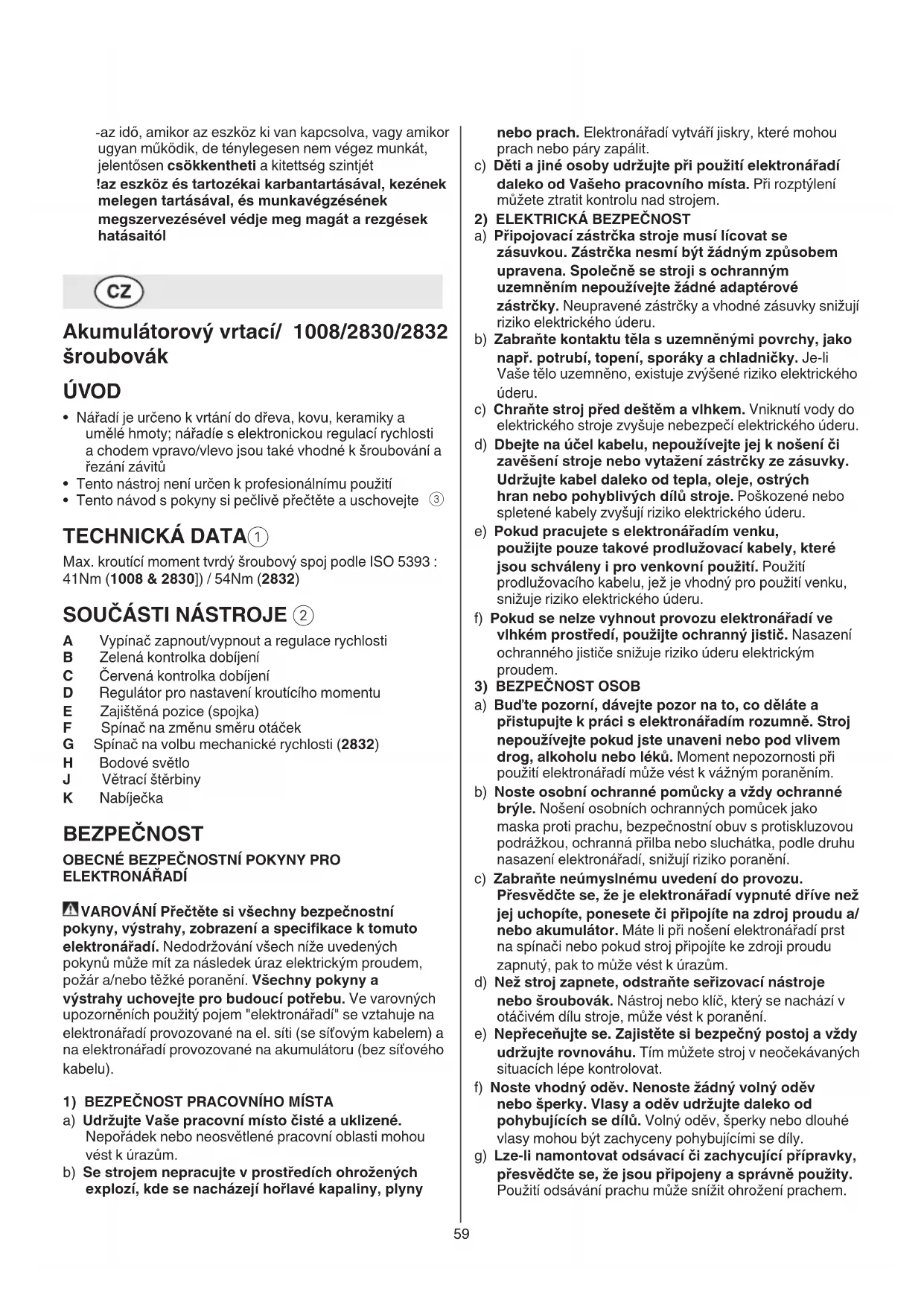 A Vypínač zapnout/vypnout a regulace rychlosti B Zelená kontrolka dobíjení C Červená kontrolka dobíjení D Regulátor pro nastavení kroutícího momentu E Zajištěná pozice (spojka) F Spínač na změnu směru otáček G Spínač na volbu mechanické rychlosti (2832) H Bodové světlo J Větrací štěrbiny K Nabíječka BEZPEČNOST