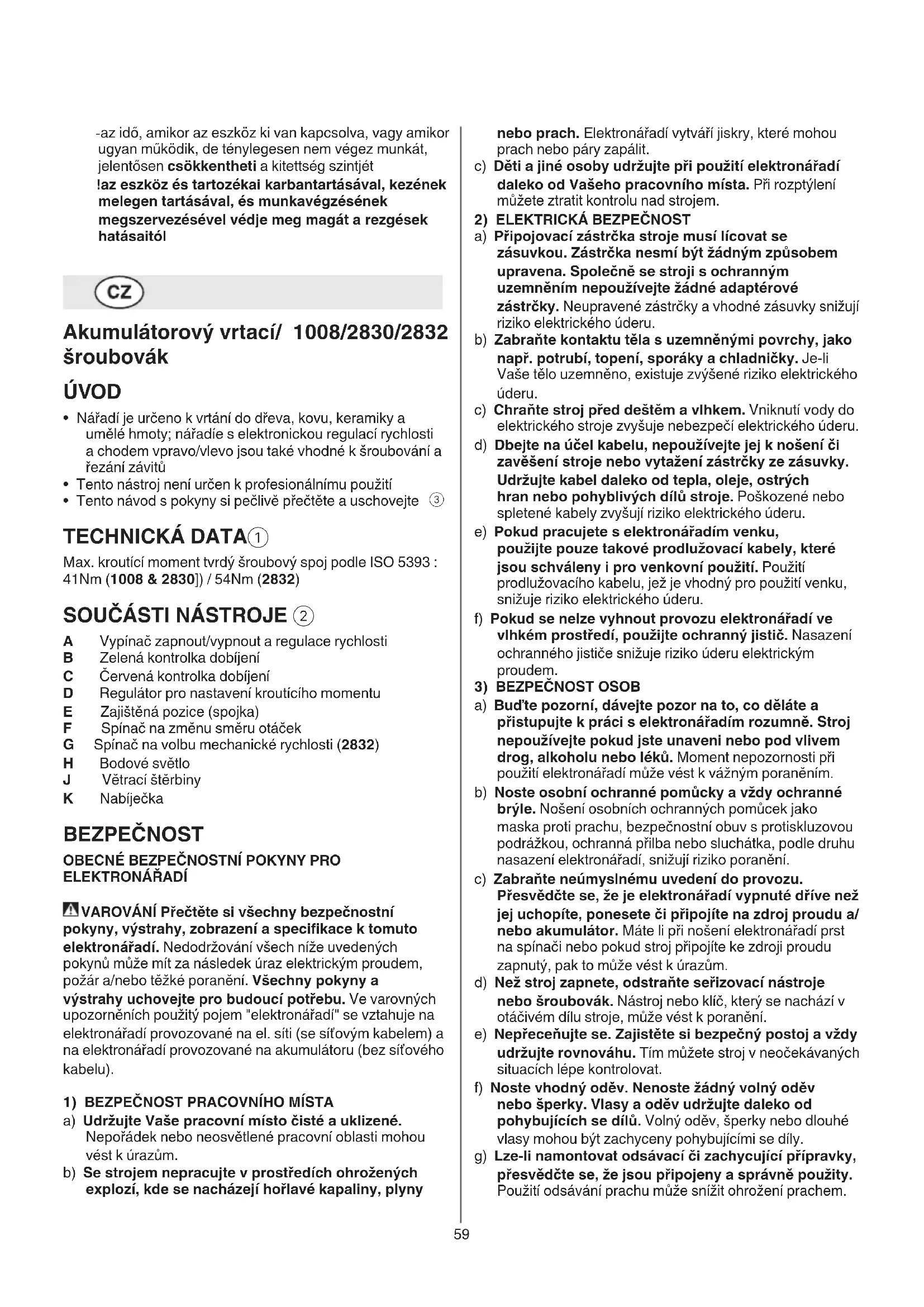 a) Buďte pozorní, dávejte pozor na to, co děláte a přistupujte k práci s elektronářadím rozumně. Stroj nepoužívejte pokud jste unaveni nebo pod vlivem drog, alkoholu nebo léků. Moment nepozornosti při použití elektronářadí může vést k vážným poraněním. b) Noste osobní ochranné pomůcky a vždy ochranné brýle. Nošení osobních ochranných pomůcek jako maska proti prachu, bezpečnostní obuv s protiskluzovou podrážkou, ochranná přilba nebo sluchátka, podle druhu nasazení elektronářadí, snižují riziko poranění. c) Zabraňte neúmyslnému uvedení do provozu. Přesvědčte se, že je elektronářadí vypnuté dříve než jej uchopíte, ponesete či připojíte na zdroj proudu a/ nebo akumulátor. Máte li při nošení elektronářadí prst na spínači nebo pokud stroj připojíte ke zdroji proudu zapnutý, pak to může vést k úrazům. d) Než stroj zapnete, odstraňte seřizovací nástroje nebo šroubovák. Nástroj nebo klíč, který se nachází v otáčivém dílu stroje, může vést k poranění. e) Nepřeceňujte se. Zajistěte si bezpečný postoj a vždy udržujte rovnováhu. Tím můžete stroj v neočekávaných situacích lépe kontrolovat. f) Noste vhodný oděv. Nenoste žádný volný oděv nebo šperky. Vlasy a oděv udržujte daleko od pohybujících se dílů. Volný oděv, šperky nebo dlouhé vlasy mohou být zachyceny pohybujícími se díly. g) Lze-li namontovat odsávací či zachycující přípravky, přesvědčte se, že jsou připojeny a správně použity. Použití odsávání prachu může snížit ohrožení prachem. - az idő, amikor az eszköz ki van kapcsolva, vagy amikor ugyan működik, de ténylegesen nem végez munkát, jelentősen csökkentheti a kitettség szintjét ! az eszköz és tartozékai karbantartásával, kezének melegen tartásával, és munkavégzésének megszervezésével védje meg magát a rezgések hatásaitól Akumulátorový vrtací/ 1008/2830/2832 šroubovák ÚVOD