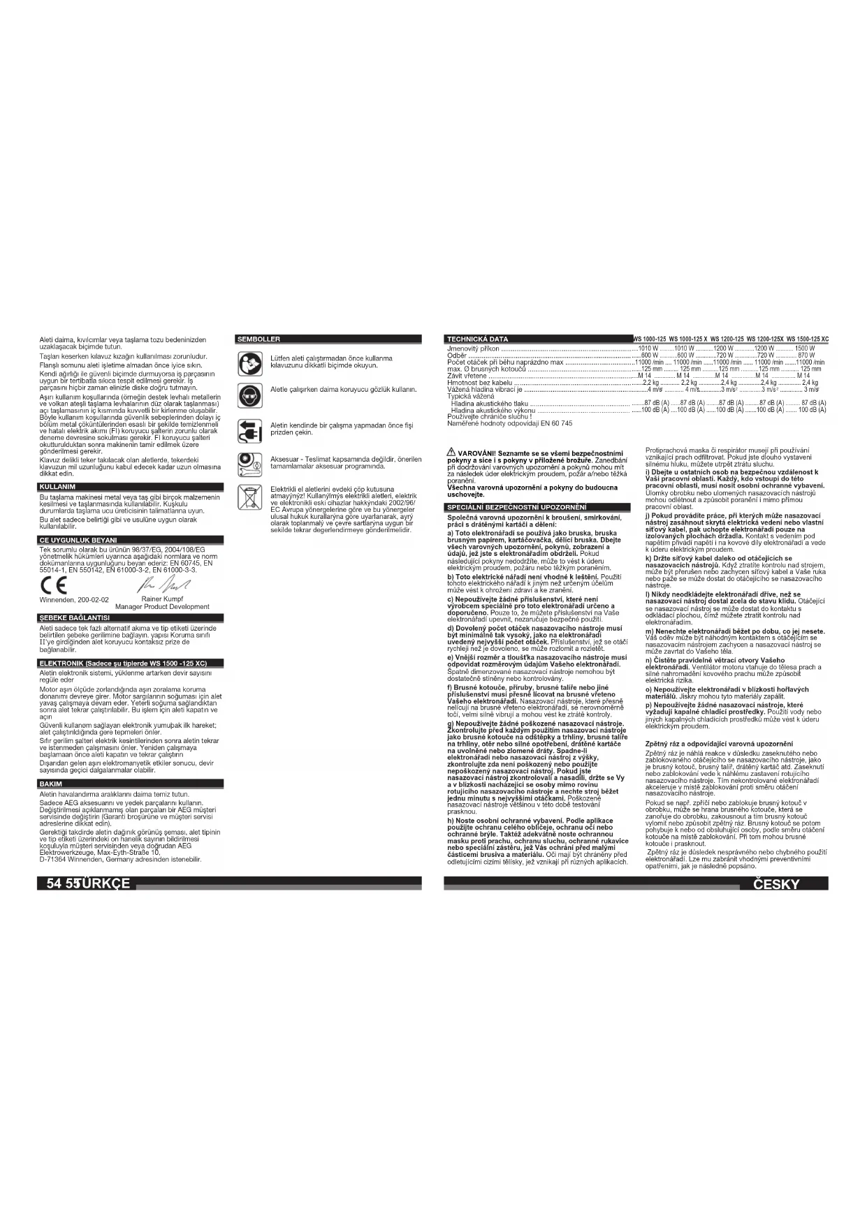 - Připojit pouze do jednofázové střídavé sítě o napětí uvedeném na štítku. Lze připojit i do zásuvky bez ochranného kontaktu neboť spotřebič je třídy II. ELEKTRONIKA (pouze u WS 1500 -125 XC) Elektronika udržuje konstantní otáčky při zátěži. Při delším přetížení přepne elektronika na snížené otáčky. Stroj běží pomalu dále, aby se rychleji ochladil. Po vypnutí a opětovném zapnutí lze stroj opět zatěžovat jmenovitým výkonem. Elektronicky řízený měkký rozběh pro bezpečnější použití stroje zabraňuje i trhavému pohybu při rozběhu stroje. Ochranný spínač zabrání znovu rozběhnutí stroje při obnovení napětí v síti po předchozím výpadku. Nejprve je nutné dát spínač do polohy vypnuto a potom Zapnout.“ Působením vnějšího extrémě silného magnetického rušení může v jednotlivých případech docházet ke kolísání otáček. ÚDRŽBA Větrací štěrbiny nářadí udržujeme stále čisté. Používejte výhradně příslušenství a náhr.díly AEG. Díly jejichž výměna nebyla popsána nechte vyměnit v autorizovaném servisu AEG ( Dbejte pokynů uvedených v záručním listě.) Při potřebě podrobného rozkresu konstrukce, oslovte informací o typu a desetimístném objednacím čísle přímo servis a nebo výrobce, AEG Elektrowerkzeuge, Max-Eyth-Straße 10, D-71364 Winnenden, Germany SYMBOLY Před spuštěnám stroje si pečlivě pročtěte návod k používání. Při práci se strojem neustále nosit ochranné brýle. Před zahájením veškerých prací na vrtacím kladivu vytáhnout síťovou zástrčku ze zásuvky. Příslušenství není součástí dodávky, viz program příslušenství. Elektrické náradí nevyhazujte do komunálního odpadu! Podle evropské smernice 2002/96/EG o nakládání s použitými elektrickými a elektronickými zarízeními a odpovídajících ustanovení právních predpisu jednotlivých zemí se použitá elektrická náradí musí sbírat oddelene od ostatního odpadu a podrobit ekologicky šetrnému recyklování. ČESKY ČESKY58 59 WS 1000-125 WS 1000-125 X WS 1200-125 WS 1200-125X WS 1500-125 XC p. 1010