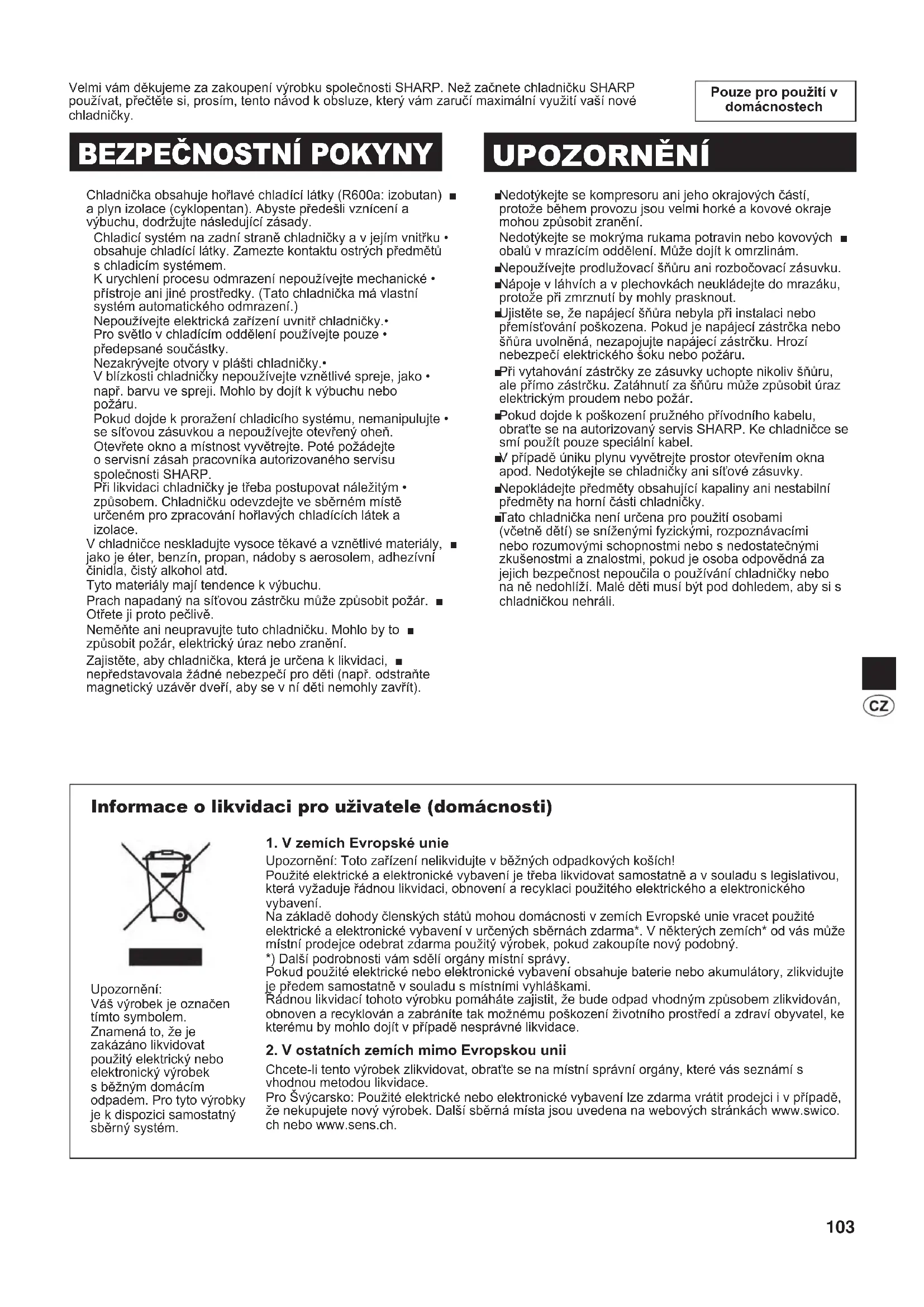 UPOZORNĚNÍ Nedotýkejte se kompresoru ani jeho okrajových částí, ■ protože během provozu jsou velmi horké a kovové okraje mohou způsobit zranění. Nedotýkejte se mokrýma rukama potravin nebo kovových ■ obalů v mrazícím oddělení. Může dojít k omrzlinám. Nepoužívejte prodlužovací šňůru ani rozbočovací zásuvku. ■ Nápoje v láhvích a v plechovkách neukládejte do mrazáku, ■ protože při zmrznutí by mohly prasknout. Ujistěte se, že napájecí šňůra nebyla při instalaci nebo ■ přemísťování poškozena. Pokud je napájecí zástrčka nebo šňůra uvolněná, nezapojujte napájecí zástrčku. Hrozí nebezpečí elektrického šoku nebo požáru. Při vytahování zástrčky ze zásuvky uchopte nikoliv šňůru, ■ ale přímo zástrčku. Zatáhnutí za šňůru může způsobit úraz elektrickým proudem nebo požár. Pokud dojde k poškození pružného přívodního kabelu, ■ obraťte se na autorizovaný servis SHARP. Ke chladničce se smí použít pouze speciální kabel. V případě úniku plynu vyvětrejte prostor otevřením okna ■ apod. Nedotýkejte se chladničky ani síťové zásuvky. Nepokládejte předměty obsahující kapaliny ani nestabilní ■ předměty na horní části chladničky. Tato chladnička není určena pro použití osobami ■ (včetně dětí) se sníženými fyzickými, rozpoznávacími nebo rozumovými schopnostmi nebo s nedostatečnými zkušenostmi a znalostmi, pokud je osoba odpovědná za jejich bezpečnost nepoučila o používání chladničky nebo na ně nedohlíží. Malé děti musí být pod dohledem, aby si s chladničkou nehráli. Informace o likvidaci pro uživatele (domácnosti)