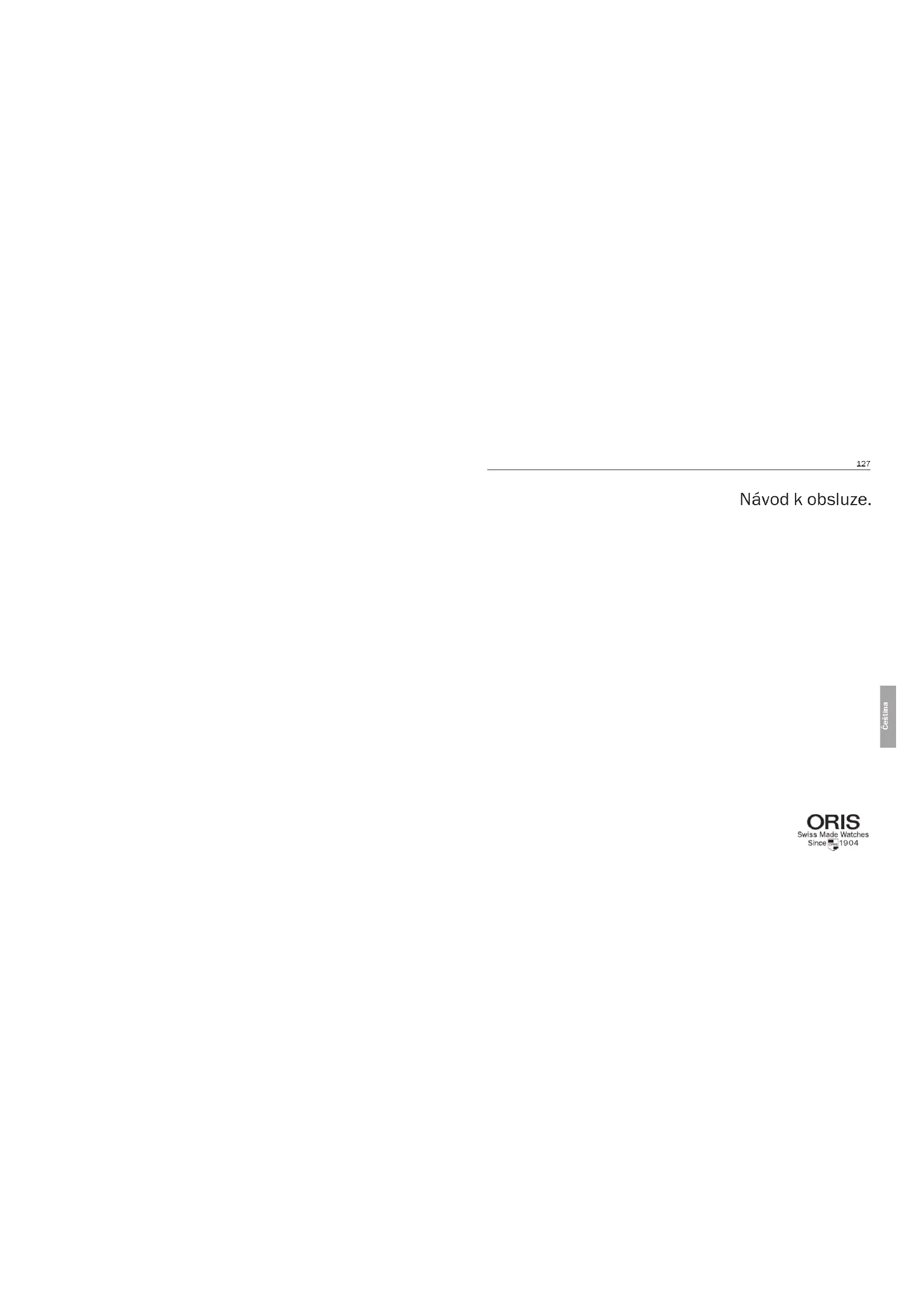 ČeštinaBlahopřejeme Vám k Vašemu vý- běru hodinek a vítáme Vás mezi příznivce mechanických hodinek značky Oris. Hodinky Oris předčí všední, hro- madně vyráběné výrobky a módní výstřelky. Namísto toho ztělesňují skutečné hodnoty hodinářské práce. Kombinace okouzlení mik- romechanickým srdcem a vnějšího vzhledu, který odolává módním trendům, činí z Vašich hodinek do- konalý obraz špičkové technologie a mnohaleté tradice švýcarského hodinářství. Nejde přitom jen o správný čas; každý jednotlivý aspekt hodinek byl zvážen a doko- nale proveden. Díky tomu hodinky vyjadřují svou nadčasovou hod- notu. Další velmi důležitá výhoda v sou- časné moderní době:hodinky Oris nepotřebují žádné baterie, neboť energie k jejich chodu je dodávána pohybem Vaší ruky nebo ručním natahováním. Navštivte naše webové stránky www.oris.cz, kde naleznete další informace. Na stránkách se také můžete přihlásit do členského klubu MyOris, čímž získáte zdarma prodlouženou záruční dobu na Vaše hodinky. Přejeme Vám příjemné zážitky s hodinkami Oris. Ulrich W. Herzog Výkonný ředitel Vysvětlení instrukčních značek: = provozní instrukce = užitečné informace Představení. 131 ČeštinaU většiny hodinek Oris s automatic- kým nátahem můžete průhledným zadním víčkem pozorovat pracující červený rotor, charakteristický znak hodinek Oris. Ručně natahované hodinky.