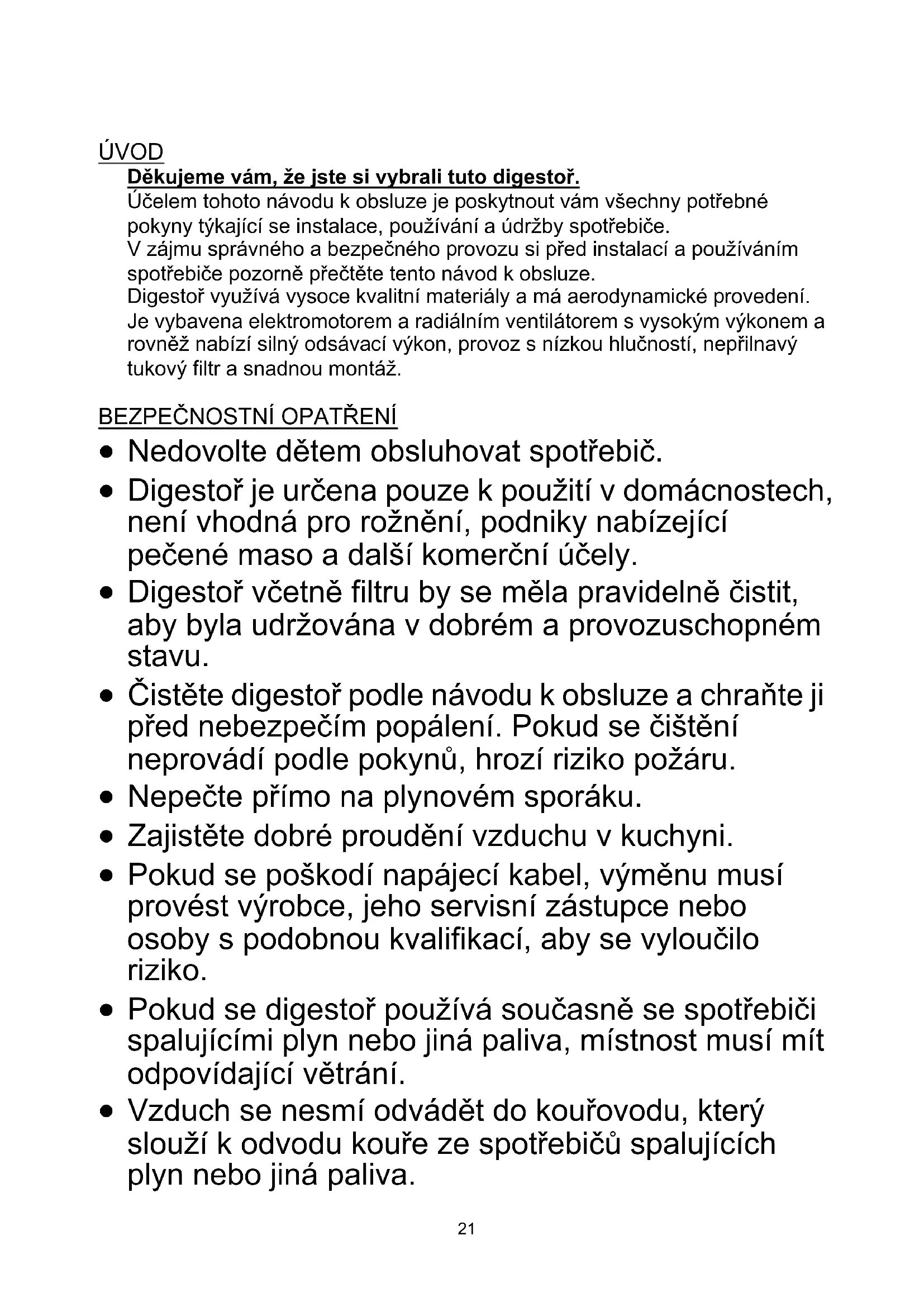 ÚVOD Děkujeme vám, že jste si vybrali tuto digestoř. Účelem tohoto návodu k obsluze je poskytnout vám všechny potřebné pokyny týkající se instalace, používání a údržby spotřebiče. V zájmu správného a bezpečného provozu si před instalací a používáním spotřebiče pozorně přečtěte tento návod k obsluze. Digestoř využívá vysoce kvalitní materiály a má aerodynamické provedení. Je vybavena elektromotorem a radiálním ventilátorem s vysokým výkonem a rovněž nabízí silný odsávací výkon, provoz s nízkou hlučností, nepřilnavý tukový filtr a snadnou montáž.