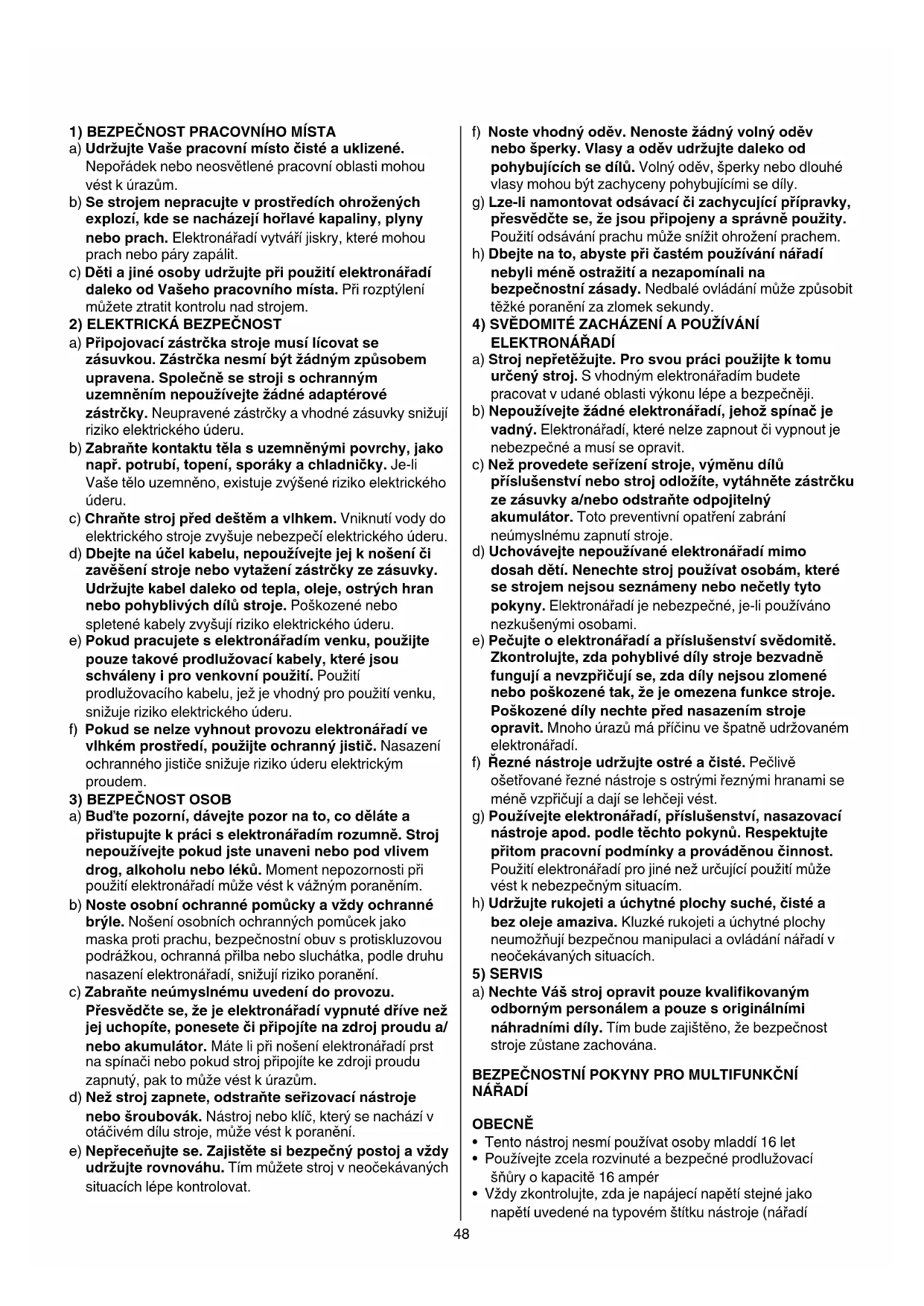ELEKTRONÁŘADÍ VAROVÁNÍ Přečtěte si všechny bezpečnostní pokyny, výstrahy, zobrazení a specifikace k tomuto elektronářadí. Nedodržování všech níže uvedených pokynů může mít za následek úraz elektrickým proudem, požár a/nebo těžké poranění. Všechny pokyny a výstrahy uchovejte pro budoucí potřebu. Ve varovných upozorněních použitý pojem “elektronářadí” se vztahuje na elektronářadí provozované na el. síti (se síťovým kabelem) a na elektronářadí provozované na akumulátoru (bez síťového kabelu).48