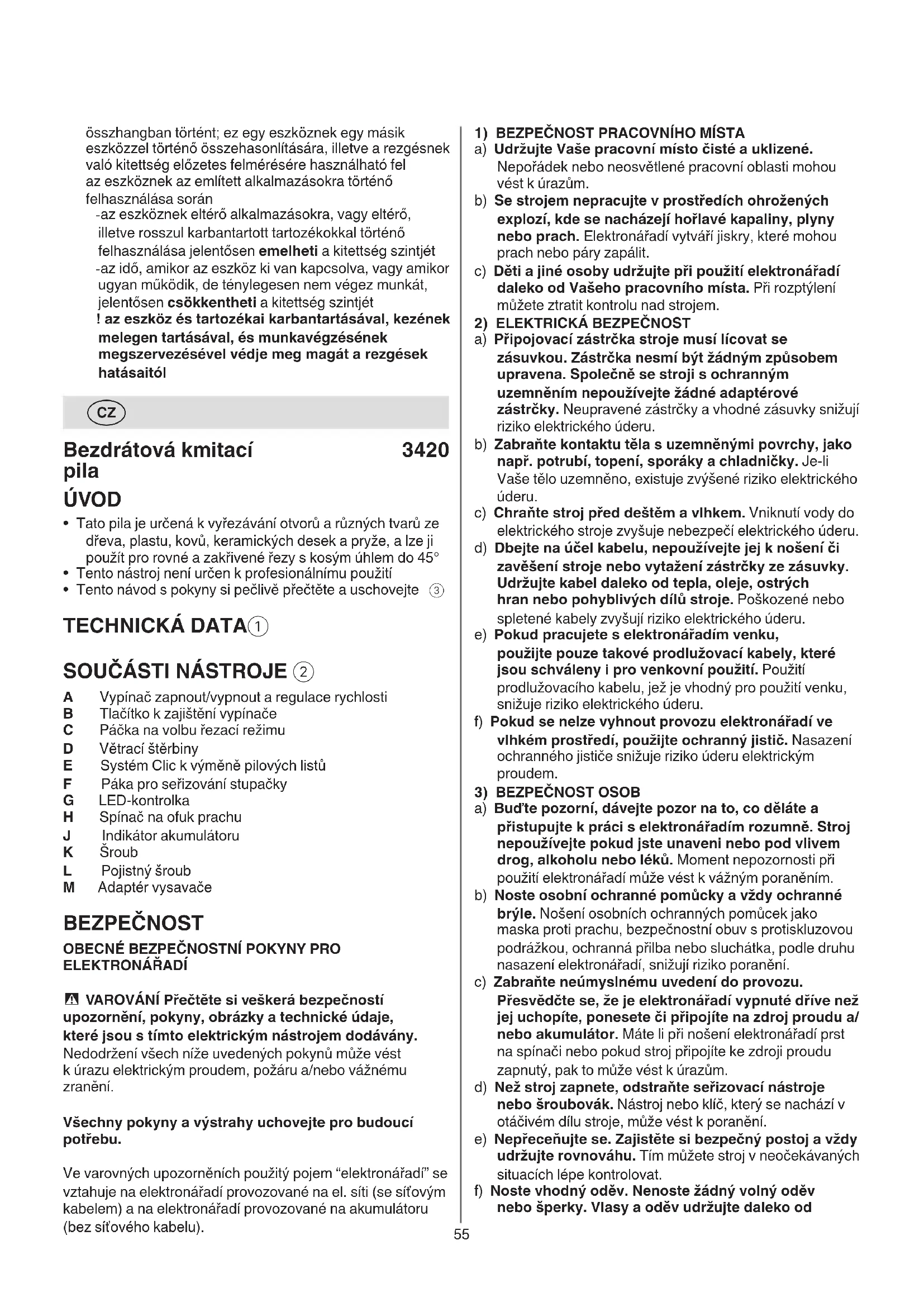 A Vypínač zapnout/vypnout a regulace rychlosti B Tlačítko k zajištění vypínače C Páčka na volbu řezací režimu D Větrací štěrbiny E Systém Clic k výměně pilových listů F Páka pro seřizování stupačky G LED-kontrolka H Spínač na ofuk prachu J Indikátor akumulátoru K Šroub L Pojistný šroub M Adaptér vysavače BEZPEČNOST