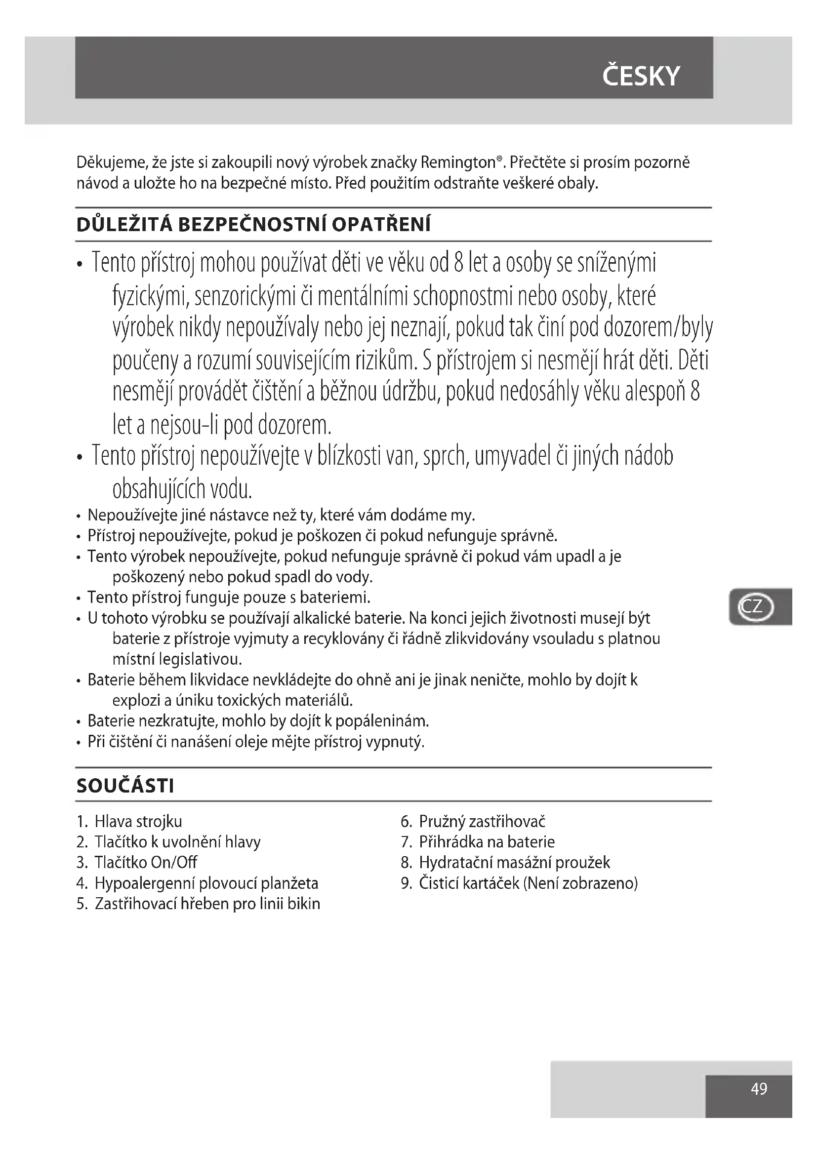 Aby nedocházelo k ničení životního prostředí a zdraví kvůli obsaženým nebezpečným látkám, přístroje a dobíjecí i nedobíjecí baterie označené jedním z těchto symbolů nesmějí být vyhazovány do směsného komunálního odpadu. Elektrické a elektronické výrobky, a pokud to přísluší, i dobíjecí i nedobíjecí baterie, vždy likvidujte na ociálním recyklačním/sběrném místě. ČESKY53 Dziękujemy za zakup nowego produktu Remington®. Przed użyciem zapoznaj się uważnie z instrukcją obsługi i zachowaj ją na przyszłość. Przed użyciem wyjmij z opakowania. WAŻNE WSKAZÓWKI DOTYCZĄCE BEZPIECZEŃSTWA
