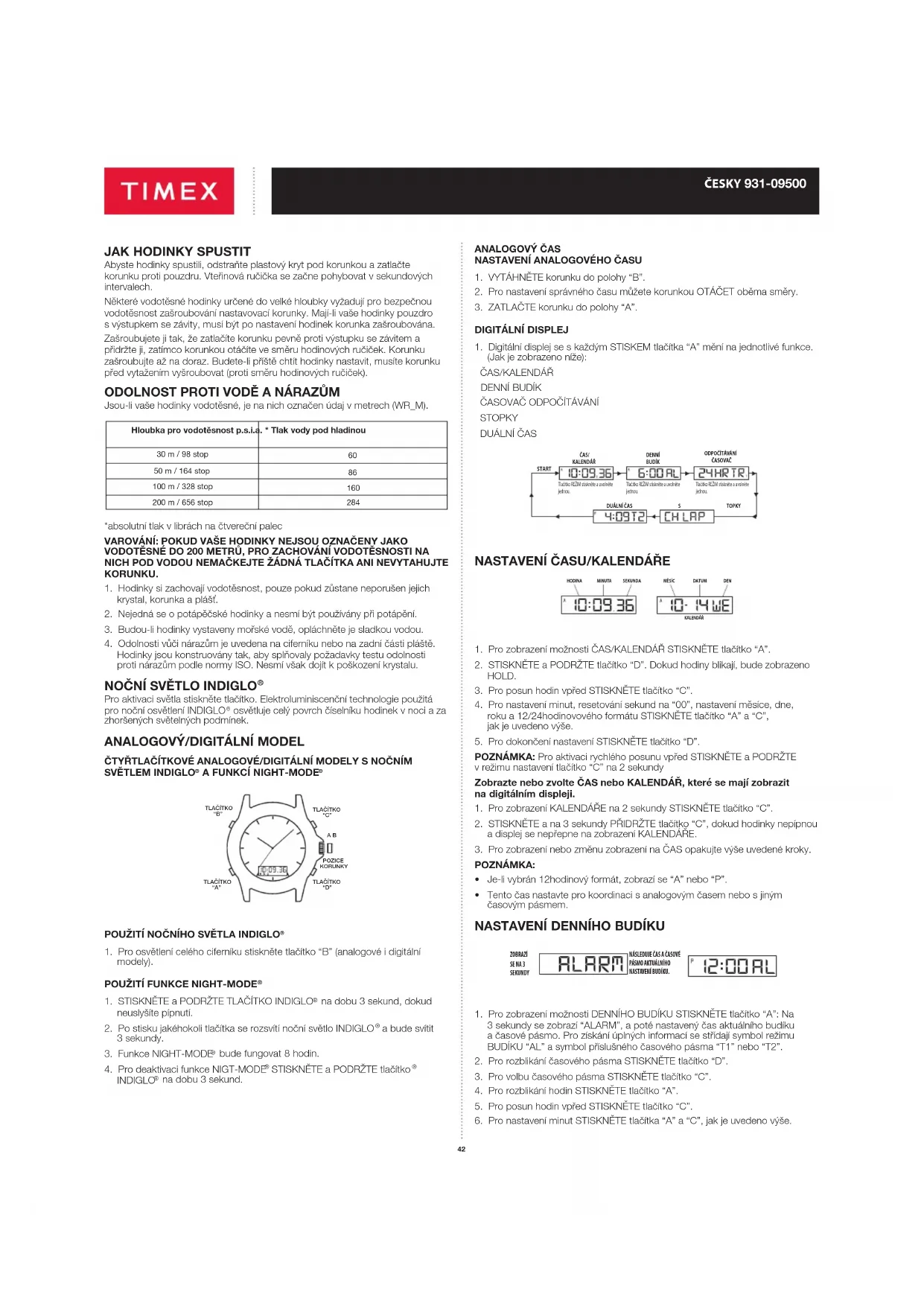 Dostupná jen v USA. Za 5 USD můžete svou záruku prodloužit na další 4 roky od data zakoupení. Zavolejte v běžnou pracovní dobu na číslo 1 800-448-4639, kde můžete platit kartou AMEX, Discover, Visa nebo Mastercard. Platba musí být provedena do 30 dnů ode dne zakoupení. Musíte uvést jméno, adresu, telefonní číslo, datum nákupu a pětimístné číslo modelu. Můžete také vypsat šek na 5 USD a poslat jej na adresu: Timex Extended Warranty, P.O. Box 1676, Dept. EF, Little Rock, AR 72203. MEZINÁRODNÍ ZÁRUKA SPOLEČNOSTI TIMEX https://www.timex.eu/en_GB/productWarranty.html ©2019 Timex Group USA, Inc. TIMEX, INDIGLO a NIGHT-MODE jsou registrované ochranné známky společnosti Timex Group B.V. a jejích dceřiných společností.45 MAGYAR 931-09500 TARTALOMJEGYZÉK Hogyan indítsuk az órát …………………………………………………………………………………………………………………………………………… 46 Víz és ütésállóság …………………………………………………………………………………………………………………………………………………………………… 46 Indiglo