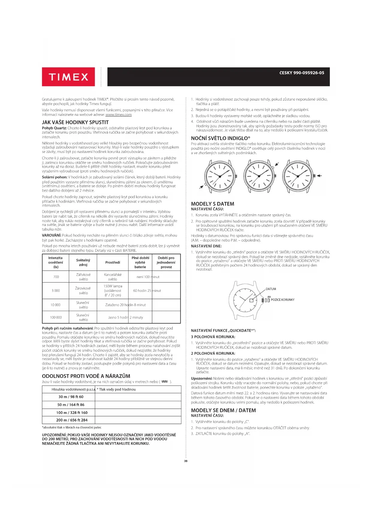 Gratulujeme k zakoupení hodinek TIMEX®. Přečtěte si prosím tento návod pozorně, abyste pochopili, jak hodinky Timex fungují. Vaše hodinky nemusí disponovat všemi funkcemi, popsanými v této příručce. Více informací naleznete na webové adrese: www.timex.com