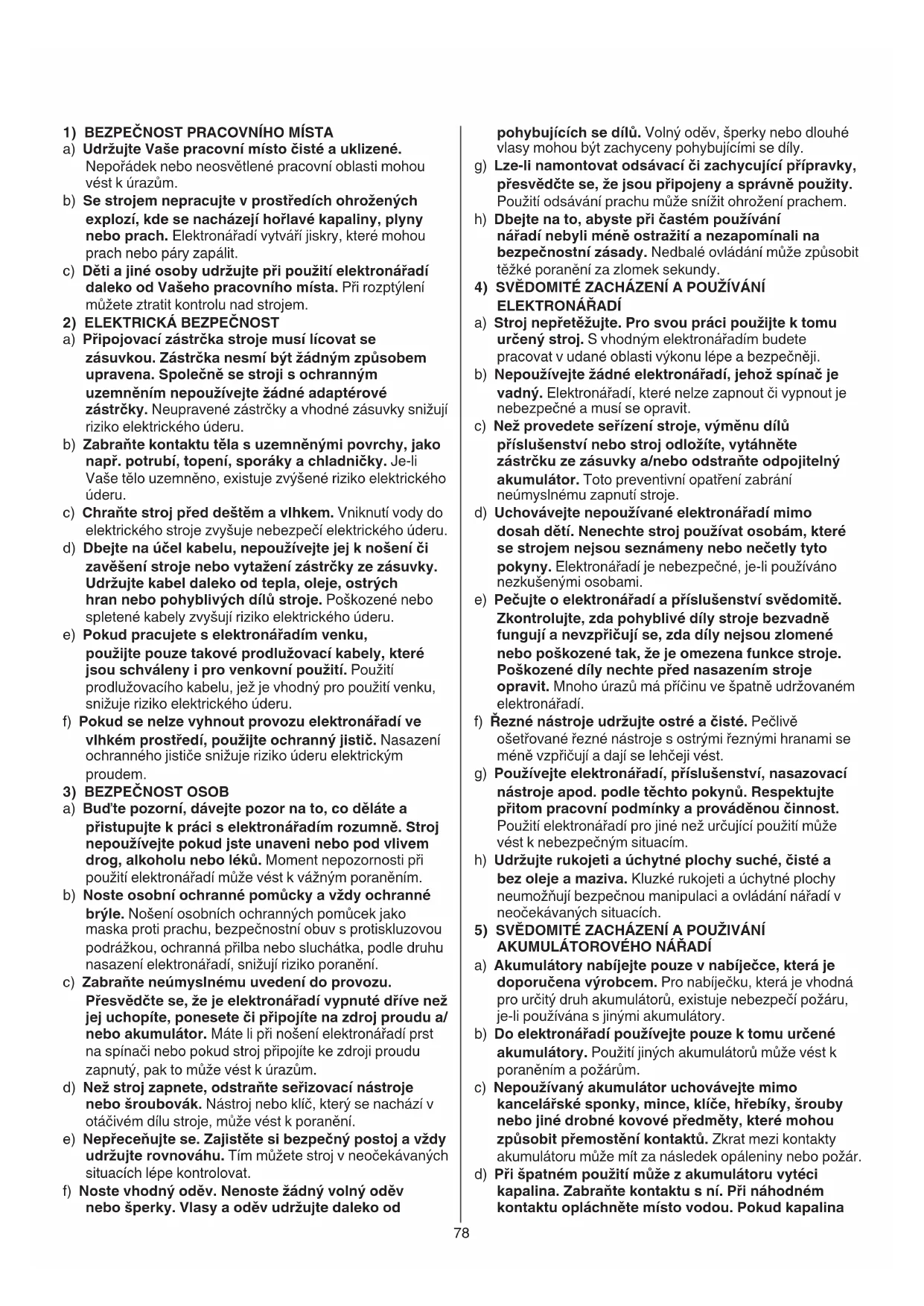 e) Pecujte o elektronáradi a prisluşenstv svédomite. Zkontrolujte, zda pohyblé díly stroje bezvadne funguji a nevzpřićuj se, zda díly nejsou zlomené nebo poskozené tak, ze je omezena funkce stroje. Poskozené díly nechte préd nasazením stroje opravit. Mnoho urazu ma prićinu ve špatné udžovaném elektronáradi.