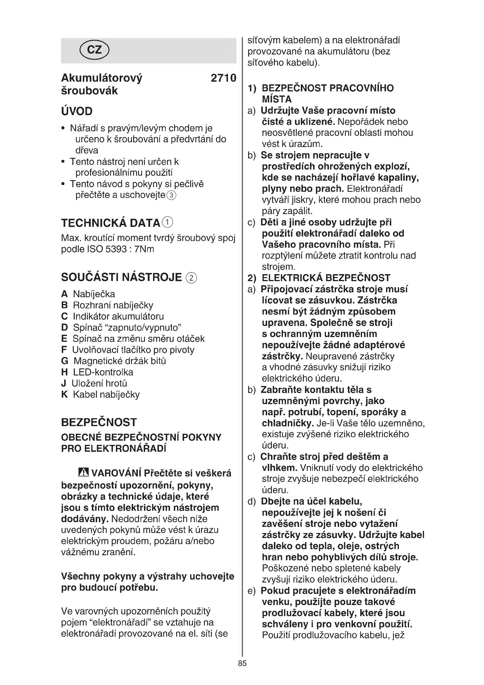 A Nabíječka B Rozhraní nabíječky C Indikátor akumulátoru D Spínač “zapnuto/vypnuto” E Spínač na změnu směru otáček F Uvolňovací tlačítko pro pivoty G Magnetické držák bitů H LED-kontrolka J Uložení hrotů K Kabel nabíječky BEZPEČNOST