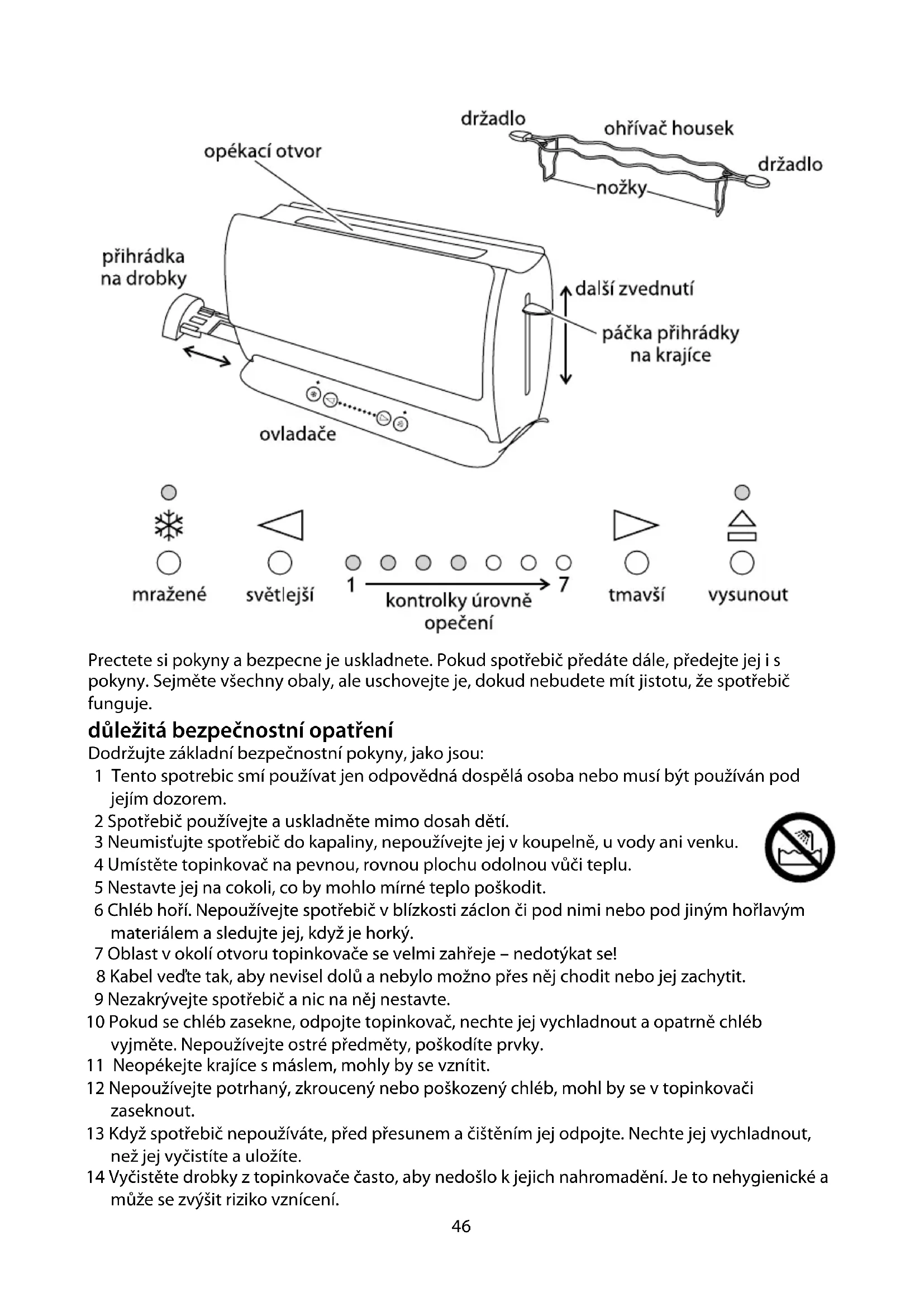 полезные советы 26 При поджаривании более одного кусочка хлеба, используйте кусочки одинакового размера, толщины и свежести. 27 Старый (вчерашний) хлеб содержит меньше влаги, тост будет более хрустящим. 28 Старый или тонкий кусок хлеба готовится быстрее, чем свежий или толстый кусок. Используйте низкую настройку. 29 Сладкие хлебобулочные изделия (кексы к чаю, пироги и т.д.) зажариваются гораздо быстрее, чем обычный хлеб, и должны поджариваться на установке «светлее». уход и техническое обслуживание 30 Отключите тостер и дайте ему остыть. 31 Протрите внешнюю поверхность влажной тканью, при необходимости используйте немного моющего средства. 32 Снимите поддон и почистите крошки с поддона. Протрите влажной тканью, вытрите и установите его обратно в тостер. 33 Не используйте тостер, если поддон для крошек не установлен и не закрыт. 34 Не помещайте прибор в воду или иную жидкость. 35 Не используйте жесткие или абразивные вещества, или растворители. символ мусорного контейнера Для того чтобы избежать угроз для здоровья и окружающей среды из-за вредных веществ в электрических и электронных товарах, приборы, отмеченные данным символом, должны утилизироваться не как не отсортированные бытовые отходы, а как восстановленные или повторно использованные.4546 Prectete si pokyny a bezpecne je uskladnete. Pokud spotřebič předáte dále, předejte jej i s pokyny. Sejměte všechny obaly, ale uschovejte je, dokud nebudete mít jistotu, že spotřebič funguje. důležitá bezpečnostní opatření Dodržujte základní bezpečnostní pokyny, jako jsou: 1 Tento spotrebic smí používat jen odpovědná dospělá osoba nebo musí být používán pod jejím dozorem. 2 Spotřebič používejte a uskladněte mimo dosah dětí. 3 Neumisťujte spotřebič do kapaliny, nepoužívejte jej v koupelně, u vody ani venku. 4 Umístěte topinkovač na pevnou, rovnou plochu odolnou vůči teplu. 5 Nestavte jej na cokoli, co by mohlo mírné teplo poškodit. 6 Chléb hoří. Nepoužívejte spotřebič v blízkosti záclon či pod nimi nebo pod jiným hořlavým materiálem a sledujte jej, když je horký. 7 Oblast v okolí otvoru topinkovače se velmi zahřeje – nedotýkat se! 8 Kabel veďte tak, aby nevisel dolů a nebylo možno přes něj chodit nebo jej zachytit. 9 Nezakrývejte spotřebič a nic na něj nestavte. 10 Pokud se chléb zasekne, odpojte topinkovač, nechte jej vychladnout a opatrně chléb vyjměte. Nepoužívejte ostré předměty, poškodíte prvky. 11 Neopékejte krajíce s máslem, mohly by se vznítit. 12 Nepoužívejte potrhaný, zkroucený nebo poškozený chléb, mohl by se v topinkovači zaseknout. 13 Když spotřebič nepoužíváte, před přesunem a čištěním jej odpojte. Nechte jej vychladnout, než jej vyčistíte a uložíte. 14 Vyčistěte drobky z topinkovače často, aby nedošlo k jejich nahromadění. Je to nehygienické a může se zvýšit riziko vznícení.47 pokyny 15 Nepoužívejte topinkovač, pokud není přihrádka na drobky nasazená a uzavřená. 16 Udržujte spotřebič a kabel mimo plotny, sporáky či hořáky. 17 Nepoužívejte spotřebič pro jiný účel, než je uvedeno v těchto pokynech. 18 Tento spotřebič nesmí být ovládán externím časovačem nebo systémem dálkového ovládání. 19 Nepoužívejte spotřebič, je-li poškozen nebo se objevují poruchy. 20 Pokud je poškozený kabel, musí jej vyměnit výrobce, jeho servisní zástupce nebo osoba podobně kvalifikovaná, aby nedošlo k riziku. jen pro domácí použití tlačítka ovládání
